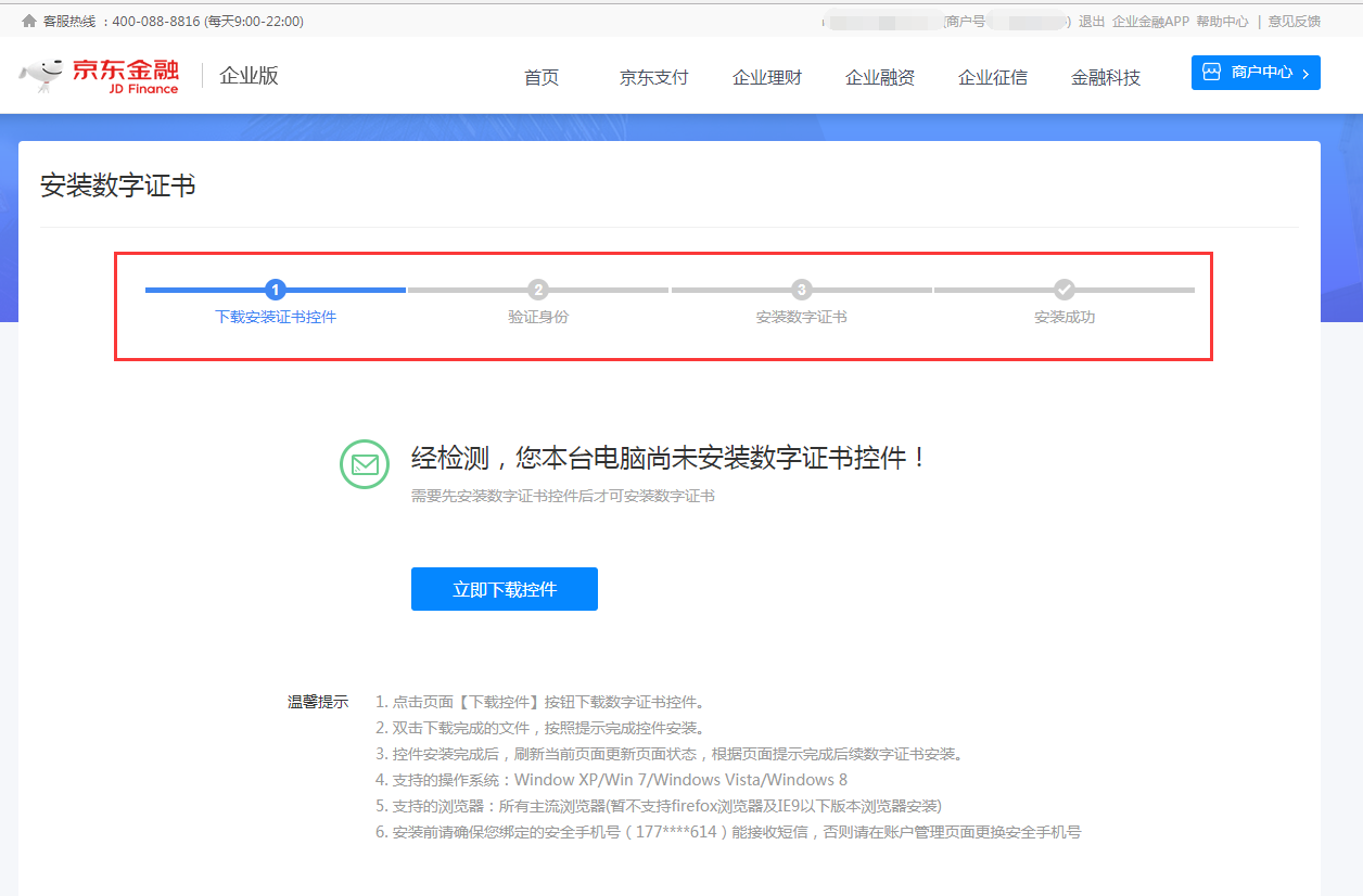 京麦工作台作为一款专为京东商家开发的店铺运营管理工具,由于涉及网络交易,因此安装数字证书是必不可少的,下面我们就来详细介绍安装步骤。 京麦工作台如何安装数字证书? 1、找到数字证书。依次点击【商户中心49. 工作上的不如意是正常的,暂时的挫折会很快过去的,有我在支持着你,作你的后盾,还有咱们深情伟大的爱,你还怕什么,一切困难都是能够觖决的。】—【账户管理】,弹出账户管理界面,在账号安全一栏中找到【数字证书】,点击右侧对应的【启用】或【管理】。 注意: 1)对于使用老版的用户依次点击【安全中心】—【用户设置】,就可以找到数字证书。 2)启用数字证书之前需要商户先绑定安全手机号和邮箱。  2、弹出安装数字界面,按照系统提示逐步安装。 1)下载安装证书控件。点击【立即下载控件】,系统会自行完成控件下载安装。  2)验证身份。这里需要商户绑定的安全手机完成手机验证,然后在电脑别称一项中输入证书适用的场合(比如办公室电脑、商铺电脑等等),最后点击【确认提交】。  3)安装数字证书。点击【立即安装】,系统会自动下载安装数字证书,安装成功后在“已安装数字证书管理”一栏中可以查看到安装记录。  以上就是关于京麦工作台如何安装数字证书的方法介绍,为了保证用户账号安全,同一账号每天最多可以申请三张数字证书。 -