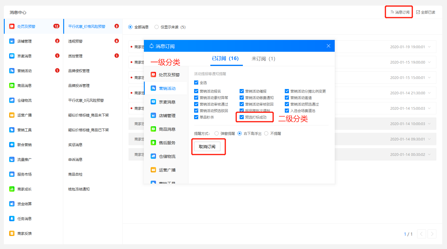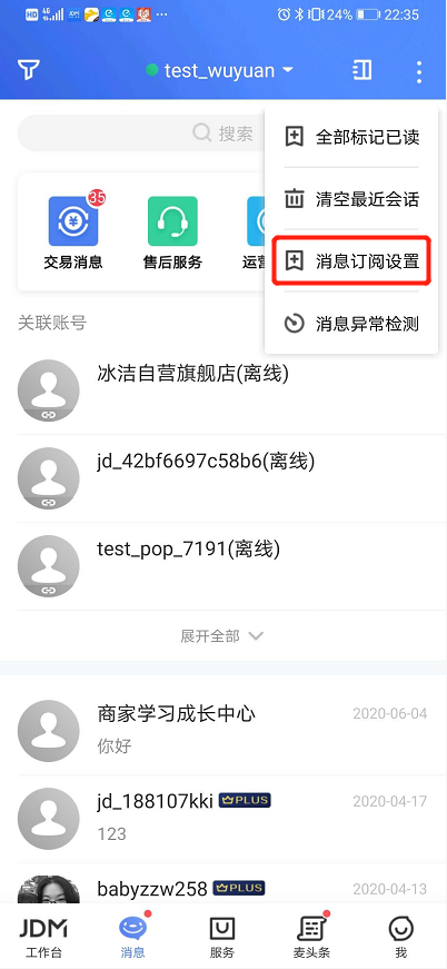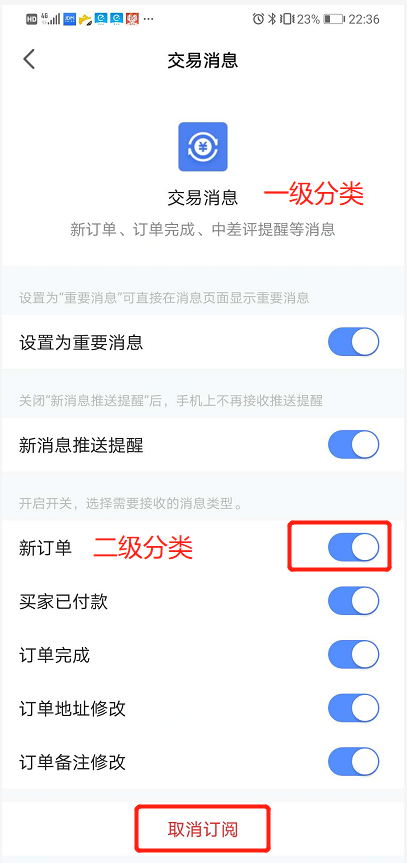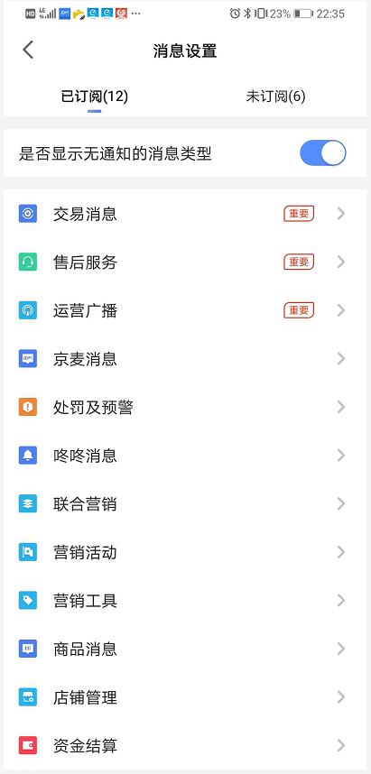 有些用户在使用京麦工作平台时遇到无法接收系统消息(如订单、售后等系统消息)的情况,不知道如何解决,下面列举了最常见的收不到系统消息几种情况,我们逐一介绍对应的解决办法。 京麦工作台收不到推送消息怎么办? 一、如果子账号收不到系统消息,用户可以通过主账号调整子账号消息权限的方法来解决。目前商户可以通过商家后台、京麦APP两种客户端进行设置。 1、 通过商家后台设置。 1)使用商户主账号登录登录商家后台,依次点击【账号管理】—【员工管理】,在右侧子账号列表中选择要授权的子账号,然后点击【员工信息】。  2)弹出垂死挣扎拼音:chuí sǐ zhēng zhá释义:垂将近。临死前的挣扎,妄想延长生命。比喻行将灭亡之时的孤注一掷。出处:冯德英《迎春花》第十七章不料,炸成重伤的蒋子金,垂死挣扎地用手里的小剜刀去刺好的腿。”示例:无员工信息界面,点击“搭配角色及账户权限”一栏右侧【补充权限】。  3)弹出“请选择权限”窗口,点击【消息推送】,并其右侧列表中勾选需要推送的消息类型,最后点击【确定】,即可完成设置。  2、通过京麦APP设置 1)打开京麦APP,登录商家主账号,点击右下方选项【我】,然后点击【我的员工】,在新弹出窗口中选择【商家后台权限】。   2)在子账号列表中选择需要授权的子账号名称,比如这里选择“测试专员1”,然后会进入该子账号权限界面,首先显示一级权限,在其中选择【消息推送】,然后会显示二级权限,在其中勾选需要的消息类型,最后点击【保存】即可完成设置。    二、如果京麦APP端收不到系统消息,可以通过以下方法来解决,这里以pop商家设置为例来说明。 1、查看系统消息订阅、接收设置 1)登录京麦APP,点击右上方三点图标,在其下拉菜单中点击【消息订阅设置】,然后会弹出“消息设置”窗口,该窗口显示一级分类的消息列表,选择任一消息类型比如【交易消息】。   2)弹出【交易消息】窗口,在该窗口中可以对更具体的消息类型进行选择(比如新订单、买家付款等),为了方便区分,我们讲这些更具体消息类型称为二级分类。如果要退订整个【交易消息】,点击下方【取消订阅】即可。  2、查看推送时间设置。 登录京麦APP,依次点击【我】—【设置】—【消息提醒与设置】,设置推送时间。   三、如果京麦PC端收不到系统消息,可以通过查看修改以下设置来解决,这里还以pop商家设置为例来说明。 1、查看系统消息订阅、接收设置。 点击PC端界面右上方【消息订阅】,弹出消息订阅窗口,在该窗口中也有一级分类和二级分类,设置方法参看上面的京麦APP相关设置方法。  2、关于京麦PC端提示方式的设置。 用户可针对一级分类中的消息进行提醒设置,有三种方式:弹窗提醒、右下角浮出和不提醒(有消息但无提醒)。  好了,有关京麦工作台收不到系统消息的解决方法就介绍到这里,想要学习更多相关内容,大家可以登录京东官网查询或咨询。 -