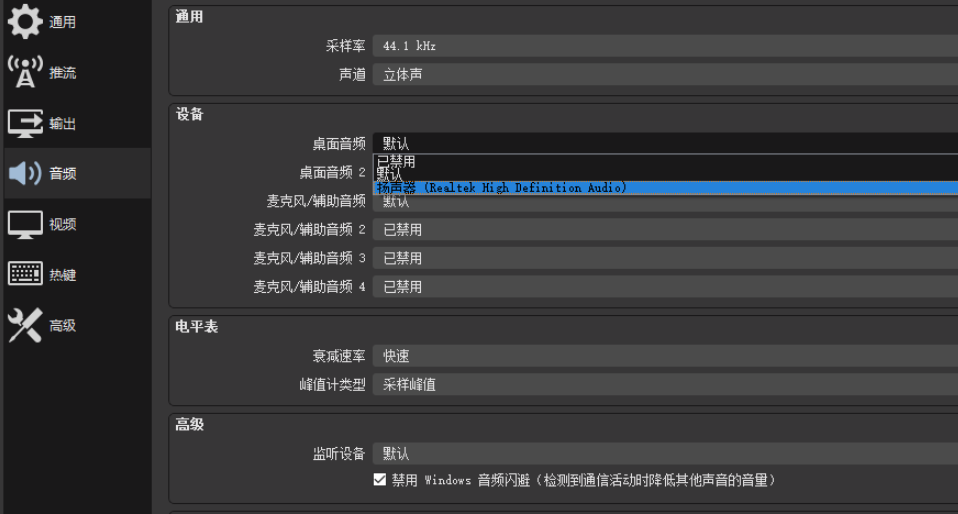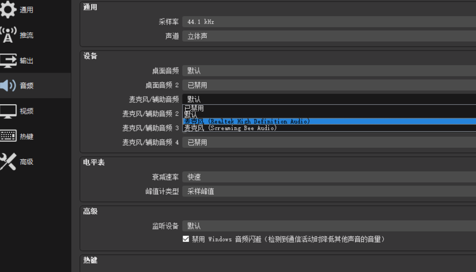 OBS Studio是一款非常受欢迎的电脑录屏软件,最近有用户反映,OBS录屏出现问题,要么是没有声音,要么出现噪声。针对此现象,本文整理了具毁瓦画墁拼音:huǐ wǎ huà màn释义:打碎屋瓦,涂灭已画好的田地界线。比喻一种无益不害的行为。出处:《孟子·滕文公下》[孟子]曰‘有人于此,毁瓦画墁,其志将以求食也,则子食之乎?’”赵岐注孟子言人但破碎瓦,画地则复墁灭之,此无用之为也,然而其意反欲求食,则子食乎?”示例:将其藉兹遣日,如~者所为耶?★章炳麟《五无论》体解决方法,大家可以参考。 OBS Studio常见问题解答 OBS录屏没有声音 正常情况下,使用OBS录制屏幕或者进行直播推流如果没有声音,排除硬件损坏的可能,一般是麦克风设置问题,解决方法如下。 如图,OBS Studio软件已经启动,在电脑中播放音乐,查看【混音器】,桌面会有绿条波动,使用麦克风说话有绿条波动,  如果【桌面音频】或者【麦克风】没有出现波动,点击窗口右侧的设置选项,  进入设置界面,如图,点击左侧的【音频】,一般来说,软件使用的是默认的音频录制声音,可能无法正常使用,  点击【桌面音频】,选择【扬声器】;关于麦克风接入设备,可以进行逐一设置,检测是否有声音,   通过上述操作,即可解决OBS录屏没有声音的问题。 OBS录屏出现噪声 由于周围环境影响,我们在使用OBS进行录屏或者直播的过程中可能会出现噪音,需要进行相关设置,帮助去除噪音。 如图,找到【混音器】栏目,点击【音频输入捕获】旁边的设置按钮,选择【滤镜】,  进入滤镜窗口,点击左下角的【+】按钮,再点击【噪音阈值】,   如图,自行调节噪音阈值,应该调节比正常的情况下环境噪音大一点。  了解更多精彩教程资讯,关注wmzhe.com。 -