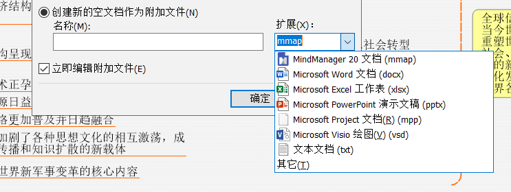 MindManager作为一款思维导图软件常常需要用到超链接功能,超链接功能虽然很方便,但是在其它设备上查看思维导图时链接的文件常常不能显示。那么如何解决这个问题呢?这里我们可以使用MindManager的“添加附件”功能,具体步骤如下: MindManager如何在思维导图中添加附件? 1、打开MindManager,选中需要添加附件的主题文件。然后点击上方工具栏中的【插入】在其下拉菜单中点村哥里妇拼音:cūn gē lǐ fù释义:指平民百姓。里,里巷。出处:明·袁宏道《东西汉通俗演义序》今天下自衣冠以至村哥里妇,自七十老翁以至三尺童子,谈及刘季起丰沛,项羽不渡乌江,王莽篡位,光武中兴等事,无不能悉数颠末,详其姓氏里居。”示例:无击【附加文件】。  2、弹出“附加文件”窗口,选“附加一个或多个现有文件”,然后点击右边的浏览文件夹图标,浏览要添加的附件(一个或多个)。  注意:勾选“附加文件”窗口左下方【立即编辑附件文件】后,可以在添加完附件后直接对附件进行编辑。 3、MindManager软件目前支持添加的附件格式有word、ppt、pdf、mmat等。添加附件后,可随时点击主题后方的附件图标,然后在其下拉菜单中选择【管理附件文件】,在弹出的窗口中对附件进行编辑。  4、下图就是弹出的“管理附加文件”窗口,在这里用户可以对附件进行打开、另存为、添加、移除、重命名等操作。  5、除了添加已有文件或文件夹,用户还可以创建新的空文档作为附加文件。具体操作:在“附加文件”窗口勾选“创建新的空文档作为附加文件”选项,然后点选右侧扩展选择空白文档的格式,点击【确定】即可。  以上就是关于MindManager软件如何添加附件的介绍。用户通过添加附件的方法完成思维导图之后,由于添加附件也成为导图的一部分,这样分享或邮送给他人的时候,添加附件也会随思维导图一起被送走,他人查看时就不会出现思维导图缺失了。 如何在MindManager思维导图中添加附件?参考图文说明七杯弓蛇影涓涓细流手八脚40. 我慢慢走着,我走爱绿之上,我走在绿之间,我走在绿之下。绿在我里,我在绿里。99. As far as I’m concerned, I am in favor of the opinion that…91.亦余心之所善兮,虽九死其犹未悔。《离骚》 闹红一舸,记来时尝与鸳鸯为侣。三十六陂人未到,水佩风裳无数。翠叶吹凉,玉容销酒,更洒菰蒲雨。嫣然摇动,冷香飞上诗句。却下水晶帘,玲珑望秋月。思维导图,MindManager14、He who has an art has everywhere a part. |