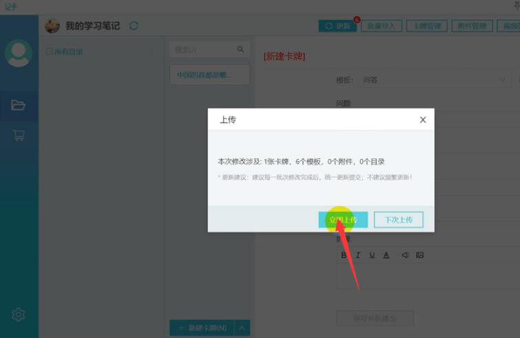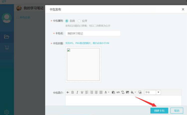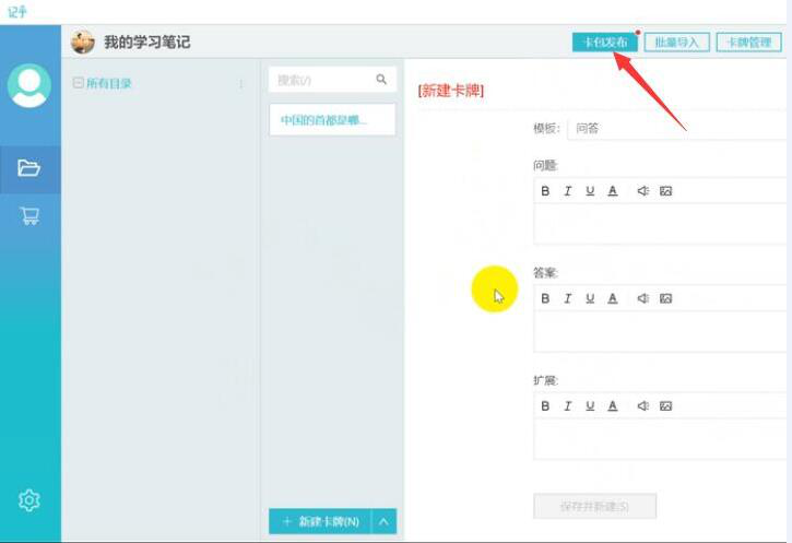 以前,我们做读书笔记的时候,基本都是采用在笔记本上手写的方式。虽然说也能加强记忆,但是这种方式很麻烦又很浪费时间,也不方便随时随地拿来看。而记乎这款记忆软件就不同了,它可以自己制作卡片,将知识点做成卡牌,这样强化记忆的效果更佳。可是,很多新用户都不了解记乎怎么自己制作卡片?所以,下面为大家讲解记乎制作卡片的方法,帮助大家提高学习效率。 记乎卡牌编辑器如何制作学习碧落黄泉拼音:bì luò huáng quán释义:碧落天上、天界。黄泉地下。天上和地下。泛指宇宙的各个角落。出处:唐·白居易《长恨歌》上穷碧落下黄泉,两处茫茫皆不见。”示例:荷君王不弃,念切思专,~为奴寻遍。★清·洪昻《长生殿·重圆》卡片? 1、首先,用户登录记乎,登录后,在它的主界面中,点击“+新建卡包”的按钮。  2、此时,记乎便会弹出新建卡包的页面。在该页面中,用户根据需要输入卡包名和选择卡包的封面,并点击“确定”按钮。其中,卡包简介一栏可不填。  3、然后,在记乎的卡片编辑界面中,点击“模板管理”选择适合自己卡片用的模板。再输入问题、答案,点击“保存并新建”的按钮。  4、将卡包的文本内容做好后,点击“卡包发布”的按钮。  5、记乎便会弹出卡包发布的页面。它默认的是自用,如果用户希望将自己制作的记乎卡片分享给更多的记乎用户使用,就可以勾选“公开”,再点击“创建卡包”的按钮。  6、随后,在记乎弹出的“上传”窗口提示中,点击“立即上传”的按钮。  7、当发布成功的时候,在记乎的界面的右上方会有相关的提示。用户打开自己手机的记乎APP,便可以看到自己刚才在记乎里制作的卡片了。  8、最后,用户点击自己用记乎制作的卡片便可以自动下载,点击“开始学习”便能学习自己的卡片内容了。  自己在记乎里制作卡片的时候,要先根据自己的需要来选择卡片的类型,它分为问答题等四个不同的类型。做好卡片内容后,要记得点击卡包发布,这样才能同步到手机端的记乎,方便自己随时随地学习。 -