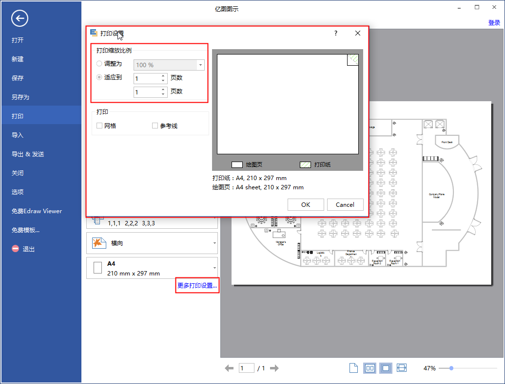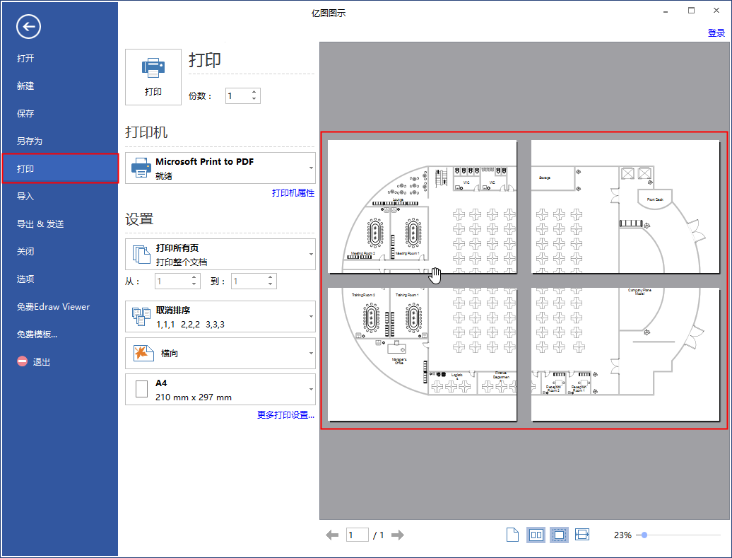 从事工程图纸绘制的人员常常碰到需要将多个文件打印到一张纸上的情况。普通打印不仅复杂而且打印效果也不理想。使用亿图软件,能够让用户快捷的实现将多个页面打印到同一张上的意图,非常方便简单。下面我们就来介绍使用亿图实现将文件打印到一张纸上的三种方法。 亿图图示如何将文件打印在一张纸中? 一、通过调整页面尺寸来实现,适用于打印机支持不同页面尺寸的情况。 1、打开亿图图示软件,将多个图片导出到软件,点击左侧【打印】选项。  2、点击图纸尺寸选项右侧三角形,改变纸张尺寸。  二、通过缩小绘图来实现。 打开亿图图示软件,将多个图片导入软件,选择左侧【打印】选项,然后点击【更多打印设置】;弹出“打印设置”窗口,在“打印缩放比例”一栏下勾选“适应到”,将“页数”前文本框都设置为1。  三、通过改变绘图页面方向实现。 这种方法适用于文件页一张单页无法容纳且文件宽度大于高度的情况,只需改变打印的排序方向水平或垂直。  以上就是关于使用亿图图示如何将文件打印到一张纸上方法的介绍。希望大家喜欢,谢谢! -