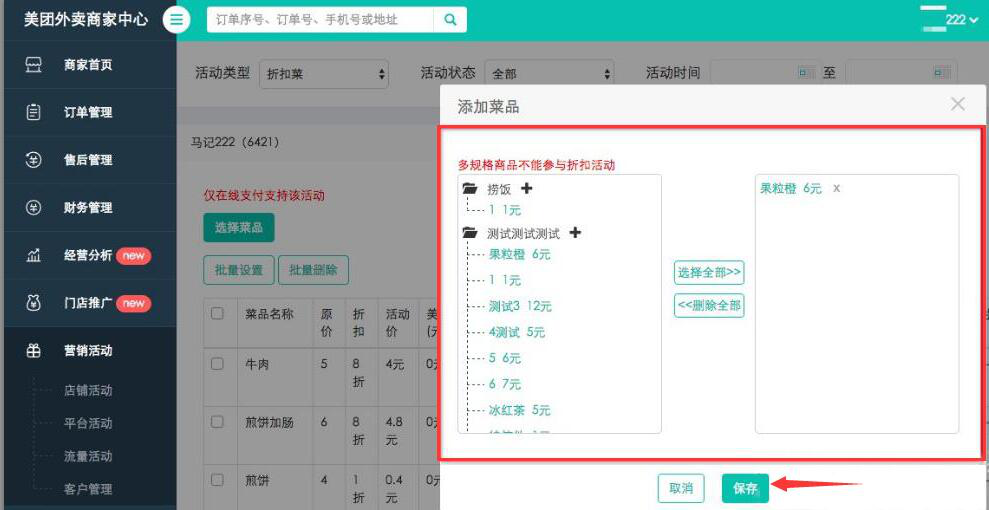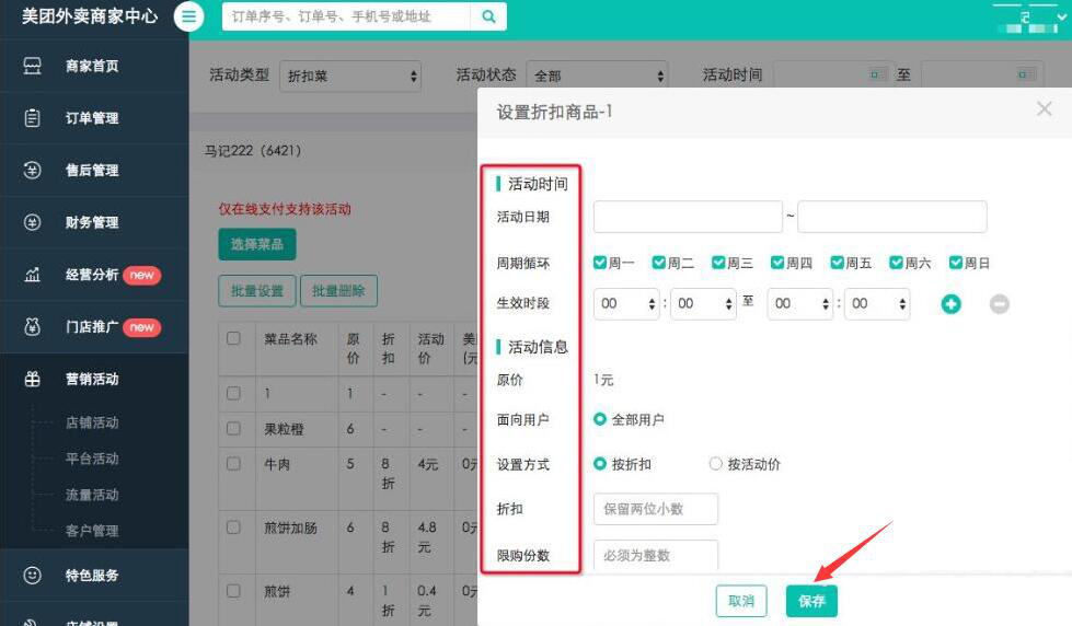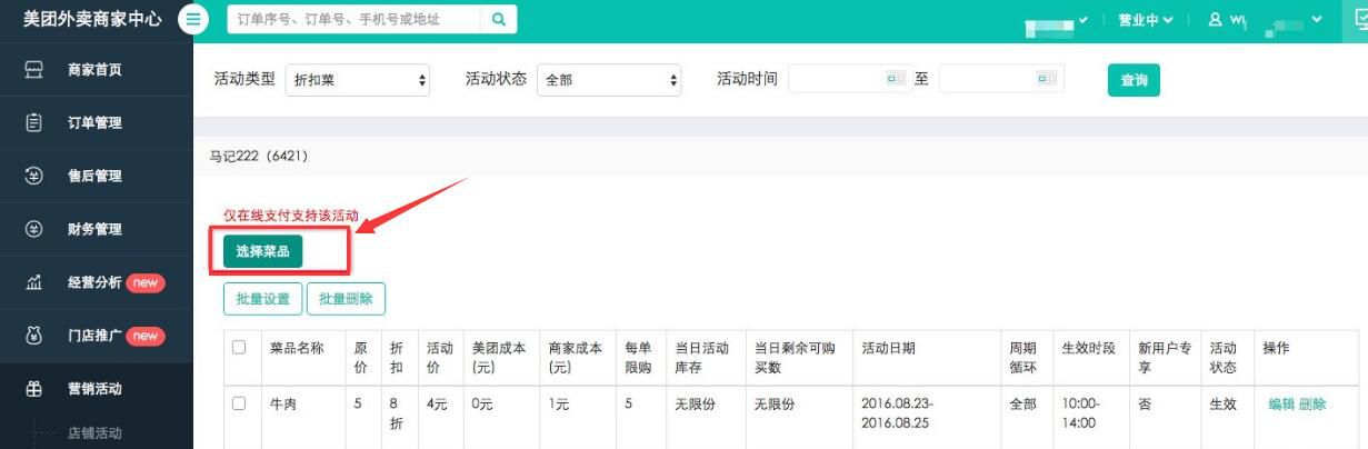 美团外卖商家为了提高店铺的收益,除了将菜品的美味做到极致,还可以通过搞一些店铺活动来吸引更多的顾客下单。例如,很多商家都会选择将顾客比较少点的菜品通过超值折扣的活动来带动它们的销量。可是很多美团外卖商家都反映不知道怎么设置超值折扣商品,在商家40. 如果活着,是上帝赋予我最大的是命,那么活着有你,将会是上帝赋予我使命中最大的恩赐。中心里研究了好久都不知道怎么操作。所以,本文为大家具体讲解它的设置方法,帮助商家们增进店铺收益。 美团外卖商家版如何设置超值折扣商品? 1、首先,登录美团外卖商家版,进入商家中心的操作界面。在操作界面左侧的营销活动中,点击“店铺活动”,并在其右侧的活动列表中点击折扣菜一栏中的“创建活动”按钮。  2、然后,美团外卖商家在活动创建的操作界面中点击“选择菜品”的按钮,将需要设置超值折扣活动的商品勾选。  3、在弹出的“添加菜品”的菜单中,美团外卖商家也可以选择全部商品参加超值折扣活动,然后点击“保存”按钮。  4、选择好活动菜品,点击菜品栏右侧操作的“编辑”功能,便会弹出如下图的设置窗口,美团外卖商家根据自己的活动需要,设置活动时间和活动信息,超值折扣商品的设置完成,点击“保存”按钮。  5、最后,美团外卖商家版便会弹出如下图的提示小窗口,说明美团外卖商家已经成功设置了超值折扣商品了,直接点击“确定”按钮即可。  一般来说,美团外卖商家在设置超值折扣商品的时候,参与折扣活动的商品不宜太多。而且超值折扣商品活动时间不宜过长,这样才能刺激顾客赶紧下单,从而提高店铺的下单量。 -
