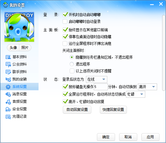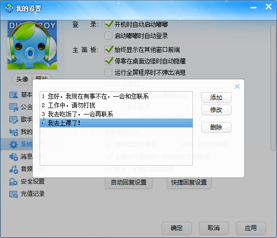 嘟嘟语音作为一款即时聊天软件,用户可以通过设置自动回复,在账号处于忙碌或暂离的情况下自动回复好友,以避免好友浪费时间。 嘟嘟语音如何设置自动回复信息? 1、打开并登录嘟嘟语音。用户可以通过嘟嘟账号、第三方账号或游客登录三种方式登录嘟嘟语音。  2、进入嘟嘟语音主界面,点击左下角嘟嘟图标,在上拉菜单中点击【我的设置】。  3、弹出我的设置窗口。在左侧选项中选择【系统设置】,在右侧状态一栏中勾选【离开或忙碌时自动回复】,然后点击【自动回复设置】。  3、弹出我的设置窗口。在左侧选项中选择【系统设置】,在惠然之顾拼音:huì rán zhī gù释义:用作欢迎客人来临的客气话。同惠然肯来”。出处:晋·袁宏《后汉纪·灵帝纪下》弥秋历冬,经迈二载,深拒以疾,无惠然之顾。”示例:无右侧状态一栏中勾选【离开或忙碌时自动回复】,然后点击【自动回复设置】。  5、新的自动回复信息就被添加到备选窗口中,选择用户需要的自动回复信息,然后点击右上方【×】关闭窗口。  6、返回我的设置窗口,点击右下角【应用】或【确定】,信息自动回复就设置好了。  以上就是关于嘟嘟语音如何设置信息自动回复的介绍,希望对大家使用嘟嘟语音软件有所帮助,谢谢! -