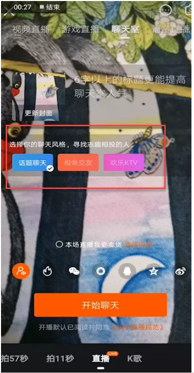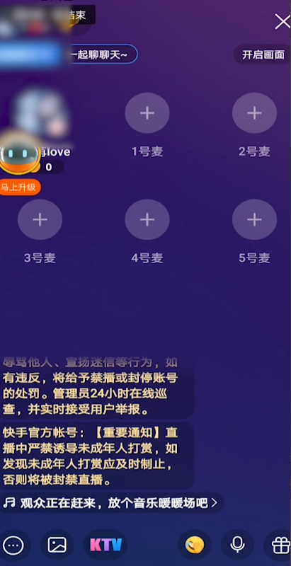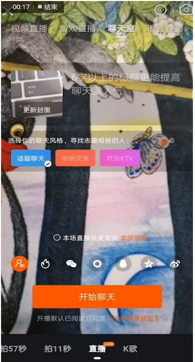 快手APP中有一项社交功能——快手聊天室,用户在发起直播之后可以创建聊天室,邀请多名观众同时在线聊天。通过这一功能,主播可以抛出话题与粉丝讨论,提高双方互动性,为直播带来更多乐趣。 快手直播间如何创建聊天室? 打开快手APP,进入界面,点击右上角的录制按钮,进入视频拍摄窗口,  如图,点击下方【直播】功能,在上方菜单栏中选择【聊天室】,  根据提示进行操作,点击添加封面,选择自己喜欢的聊天风格(话题聊天、相亲交友、欢乐KTV),然后点击【开始聊天】,即可创建聊天室,  如图,点击【+】,邀请好友上麦,好友上麦后即可进行语音通话。  如果你想让更多观众上麦聊天,点击房间空缺位置,查看在线观众和等待上麦的观众。4. 感情有时候只是一个人的事情和任何人无关爱或者不爱只能自行了断伤口是别人给予的耻辱自己坚持的幻觉。 了解更多精彩教程资讯,关注wmzhe.com。 -