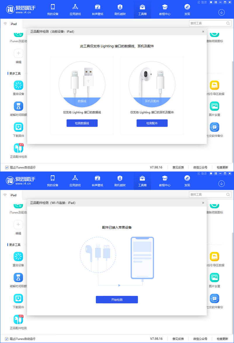 对于绝大多数苹果用户来说,他们并不会判断识别iOS设备使用的配件是否为5. 看到电视上大歌手小歌手们站在台上深情演唱,我很羡慕他们。所以我长大了要当歌手。正品,这是一个让人困扰的问题。现在好了,只要你将爱思助手PC版升级到7.98.16版本,即可获得正品配件检测功能,轻松检测iOS设备当前所连接配件是否为原装正品。 爱思助手如何检测iOS设备配件是否为正品? 准备工作: 确保iPhone/iPad和电脑连接了同一网络,如图,使用数据线连接iOS设备和电脑,打开PC爱思助手,点击【工具箱】——【设备功能开关】,弹出窗口,选择启用【Wi-Fi连接】,第一次使用“正品配件检测功能”时需要进行这一步骤,后续无需重复操作。  断开数据线,只要iPhone和电脑处于同一局域网,解锁手机屏幕,稍等片刻,爱思助手会自动连接手机。如果iPhone在长时间内没有通过WiFi连接到爱思助手,你可以尝试重启爱思助手、iPhone或者电脑。如果iPhone手机在WiFi连接状态下出现锁屏,爱思助手将会自动断开连接并提示使用数据线连接,重新解锁iPhone屏幕即可恢复连接。 具体操作: 连接成功,将耳机或者数据线等配件插入设备的Lighting接口,USB端不要连接电脑。打开爱思助手,点击【工具箱】——【更多工具】——【正品配件检测】,弹出面板,依次点击【检测数据线/检测配件】——【开始检测】,  等待检测完成,即可查看详细结果。 检测结果说明 一、制造商显示为“Apple Inc”,说明该配件为原装正品。 二、制造商显示为“无”,可能是由以下两种情况导致: (1)“无法判断该配件是否为原装正品”并不代表配件为非正品,由于批次原因,部分原装正品配件也会显示为空。 (2)“该配件为第三方厂商生产”是指配件通过苹果MFi授权认证的第三方生产厂商生产。  关于爱思助手正品配件检测功能的使用方法已经介绍结束,大家可以试一试。了解更多精彩教程资讯,关注wmzhe.com。 -