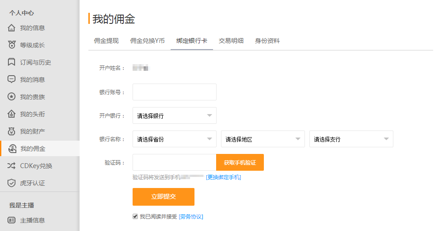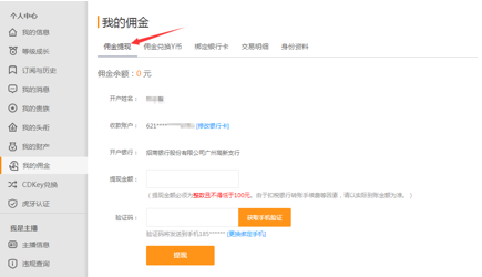 随着全民网红潮流的兴起,加盟直播平台成为很多小伙伴的选择,虎牙直播作为目前最热门的直播平台之一也备受关注。除了出于直播的爱好外,丰厚的直播收入无疑是成为主播最主要的原因。由于很多主播新手对于平台提现并不清楚,所以我们有必要详细介绍一下。 虎牙直播平台如何提现佣金? 1、打开虎牙直播个人中心网页(即http://i.huya.com)并登录主播账号。  2、点击左侧菜单栏中的【我的佣金】,然后点击右侧【去绑定】,按提示绑定主播个人基本资料和银行卡信息。  3、自动转入绑定银行卡选项界面,按提示输入银行账号信息。为了账号安全,还需要输入银行卡绑定手机的验证码。 注意: 1)绑定银行卡的用户名必须与认证主播时提交的信息一致。 2)银行卡开户行名称要准确,否则可能导致绑定失败。  4、完成银行卡绑定之后,选择【佣金提现】选项。在“提取金额”后的文本框内输入提取金额(提现金额为整数且不得低于100元),接着点击【获取手机验证码】,然后将绑定手机收到的验证码输入对应文本框,点击【提现】。平台账号上的款项就会提取到银行卡。 注意:根据目前虎牙直播提现规则,主播可在每月5号—7号提现,完成提现后银行卡一般会在次月10号—20号之前收到提款。  以上就是关于虎牙主播如何提现的介绍。要了解更多主播相关内容,请大家到虎牙官网帮助中心查找。 寸草不留拼音:cùn cǎo bù liú释义:连小草也不留下。比喻搞得精光,一无所剩。出处:宋·楼钥《攻媿集·八十一·英老真赞》大地一变,直教寸草不留。”示例:若是恼了我,连你西歧~。★明·许仲琳《封神演义》第五十九回 -