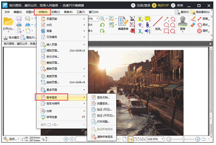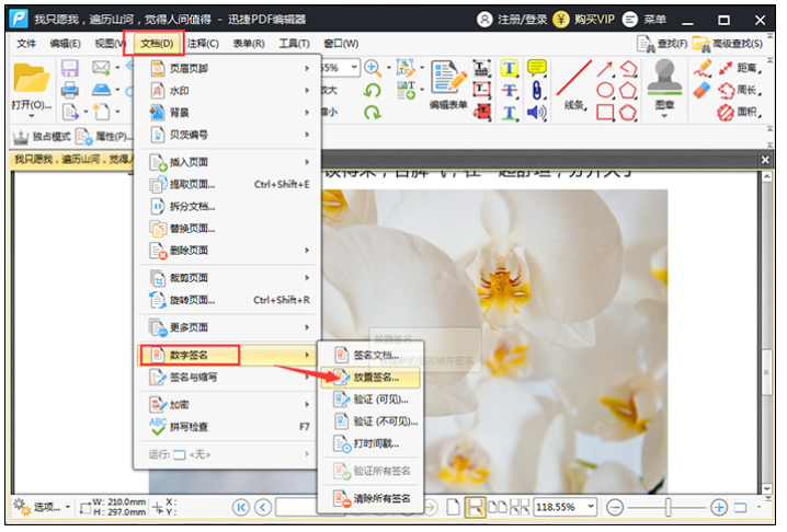 针对一些比较重要的PDF文件,我们有时候需要在文件中添加数字签名,鉴于PDF文件的特殊性,这就需要用到专业软件。如何给PDF文件添加数字签名?今天小编就来分享两种方法,有需要的小伙伴可以参考。 如何给PDF文件添加数字签名? 方法一 下载安装迅捷PDF编辑器,打开软件,注册登录账号,如图,点击【5. 生命像流水一样逝去,如是自己所愿,一定竭尽全力地坚持,如果已经一败涂地,那就痛痛快快地哭上几回,再潇洒地一笑:让一切随风而去,因为没有人在原处等你!打开更多文件】,导入PDF文件,  在软件上方菜单栏中点击【文档】——【数字签名】功能,这里有【签名文档】、【放置签名】选项,  点击【签名文档】,弹出一个面板,如图,设置数字签名,点击确定就行了,  如果PDF文件中已经有了数字签名,只需要点击【放置签名】,选择放置签名的区域,然后放置数字签名,大功告成。  方法二 除了使用专业软件,大家还可以通过在线平台给PDF添加数字签名,点击搜索迅捷PDF编辑器,进入官网,在首页中点击【在线编辑】——【PDF在线编辑】,  进入以下界面,点击【请上传PDF文件】,导入PDF文档,  文件添加之后,在右侧的编辑工具中找到箭头指示的工具,  之后在签名框中输入签名内容,输入完成,点击确定,即可在PDF文件中添加数字签名。  了解更多精彩教程资讯,关注wmzhe.com。 如何给PDF文件添加数字签名?分享两种方法一视同暴雨自鸣得意如注仁22. 书在这个世界上是不可缺少的。书主宰了这个世界。书不仅传播知识,而且传承文化,它时刻影响人们的观念意识。一本书可能引发一场战争,也可掀起一种潮,它可以影响一代人甚至几代人。因而,书拥有独特的核心能力。there is nothing better than 没有比……更好的了276.昨夜西风凋碧树,独上高楼,望尽天涯路。《蝶恋花》 望湘人 贺铸露重飞难进,风多响易沉。迅捷PDF编辑器,编辑器,PDF编辑器40、Desire has no rest. |