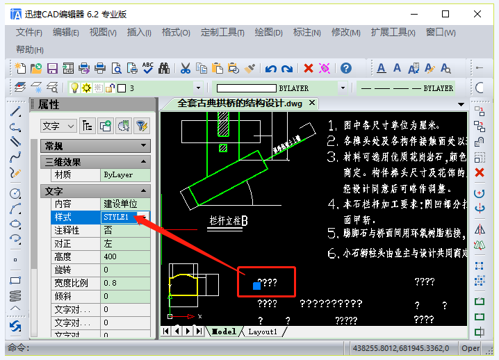 最近有小伙伴反映在查看CAD图纸的时候遇到寸步难移拼音:cùn bù nán yí释义:连一步都难移动。形容走路困难。也比喻处境艰难。出处:元·郑廷玉《楚昭公》第四折想当年在小舟中,寸步难移。”示例:无了一个问题,图纸上有一些文字无法显示,看到的就是问号,严重影响图纸信息的完整性。如果CAD图纸中的文字显示问号,大家可以通过迅捷CAD编辑器进行解决,方法如下。 CAD图纸中的文字显示为问号怎么办? 打开迅捷CAD编辑器专业版,进入软件界面,在菜单栏中点击【文件】——【打开】选项,出现弹窗,找到有问题的CAD图纸,将其导入,  如图,CAD图纸中有一些文字不能显示,变成了问号,点击问号,鼠标右击,调出【属性】栏,找到【文字】——【样式】属性,即可看到当前显示成问号的文字的文字样式为STYLE1,  遇到这一问题,大家可以采取两种解决方法,小编现在就来逐一介绍。 方法一 在【属性】栏中点击【文字】——【样式】,选择替换其他的文字样式,例如把STYLE1替换成DIM_FONT,此时CAD图纸上原本显示为问号的文字就能恢复正常,如图,  方法二 选中CAD图纸中显示成问号的文字,在菜单栏中点击【格式】——【文字样式管理】,调出文字样式管理器,  如图,你可以看到当前文字样式名为STYLE1,文本字体的【组名】是romand.shx,点击修改【大字体】,这里选择的是Stdb1.shx样式,点击【应用】——【确定】,  关闭文字样式管理器,这时你会发现CAD图纸上显示为问号的文字已经变成原来的文字。  关于CAD图纸文字显示为问号的解决方法已经介绍结束,希望能够帮助大家。了解更多精彩教程资讯,关注wmzhe.com。 -