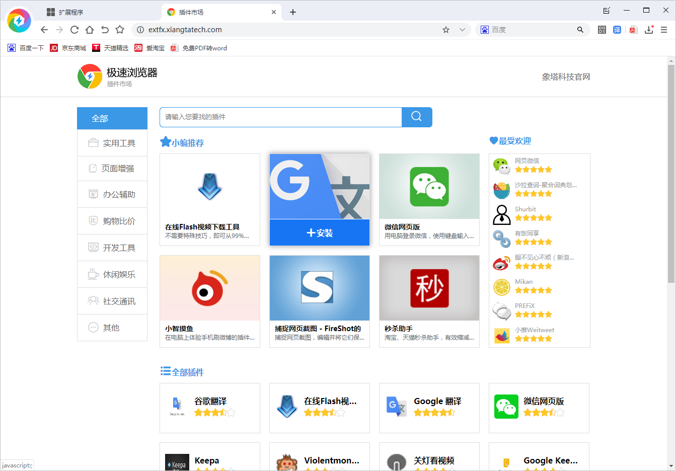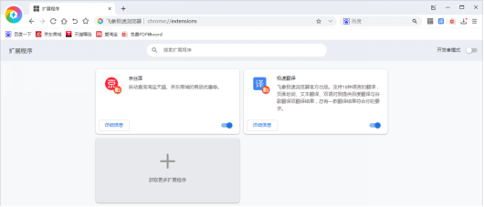 扩展插件工具50. 在遇到梦中人之前,上天也许会安排我们先遇到别人;在我们终于遇见心仪的人时,便应当心存感激。是使用飞象极速浏览器时不可或缺的助手,它能够切实增强使用飞象极速浏览器的用户体验,拓展浏览器功能,比如网购时的秒杀助手,浏览外文网站时的翻译插件,网上冲浪时的在线笔记等等。那么飞象极速浏览器如何添加扩展插件呢?下面我们就来详细说明。 飞象极速浏览器如何添加插件? 1、打开飞象浏览器,点击右上角三道横线图标,在其下拉菜单中找到并点击【扩展程序】。  2、进入扩展程序界面,点击【获取更过扩展程序】。  3、弹出插件市场界面,通过搜索栏查找需要的插件,也可以自行浏览。只需将鼠标移至要添加的插件,点击【+安装】即可。  以上就是关于飞象极速浏览器如何添加添加扩展插件的介绍。了解更多飞象极速浏览器相关问题,可以登录飞象极速浏览器官网查询。 -