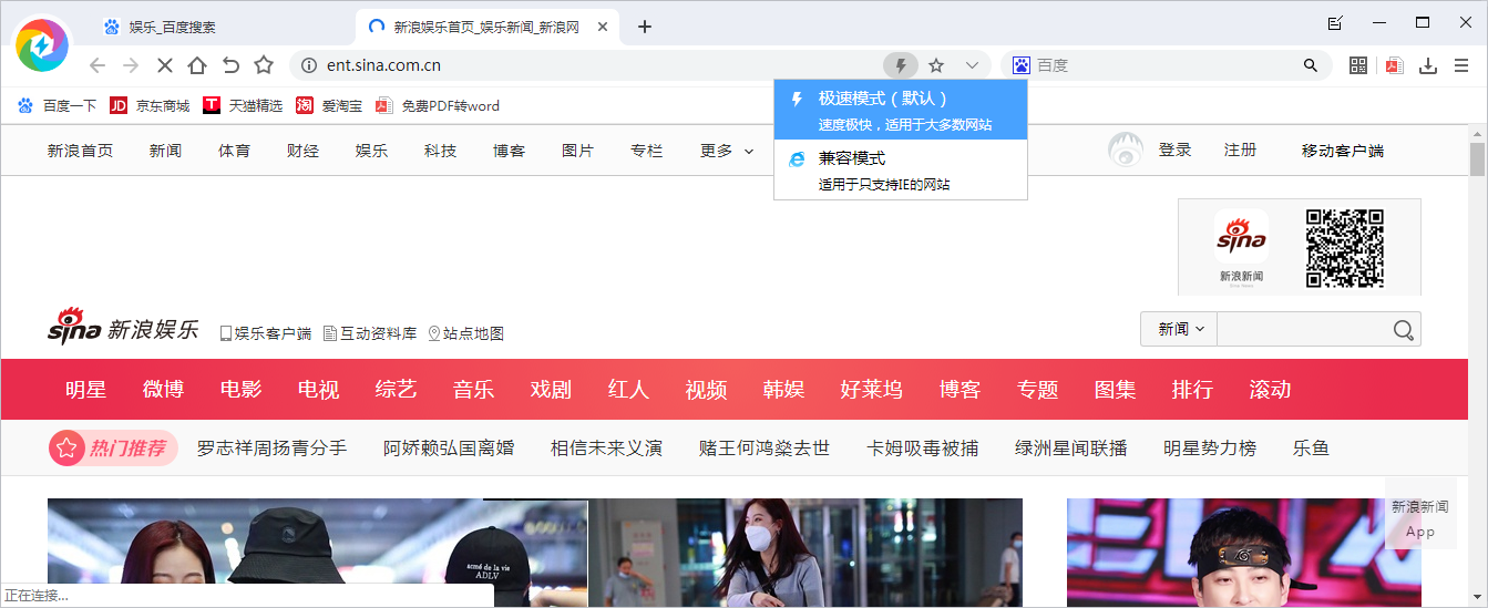 现在很多浏览器都流行双核,飞象极速浏览器也不例外。有些用户不知道双核是什么,如何切换?双核是指极速模式和兼容模式两种浏览器内核处理模式,至于如何切换,下面就以飞象极速浏览器为例,演示如何切换浏览器内核。 飞象极速浏览器如何切换内核? 1、打开飞象浏览器,然后搜索任意网页,比如在百度搜索栏中输入“娱乐”。  2、进入网页界面,选择任一娱乐网页,比如选择第一个“新浪娱乐首页”。  3、打开网页,点击地址栏右侧出现的闪电图标,在弹出的菜单中有极速模式和兼容模式两种浏览器内核,点击即可切换。  4、当然,一般情况两种内核会根据情况自动切换,无需用户手动选择。  以上就是关于飞象极速浏览器如何切换浏览器内核的介绍。了解更多飞象极速浏览器相关问题,可以登录飞象极速浏览器官网查询。 -