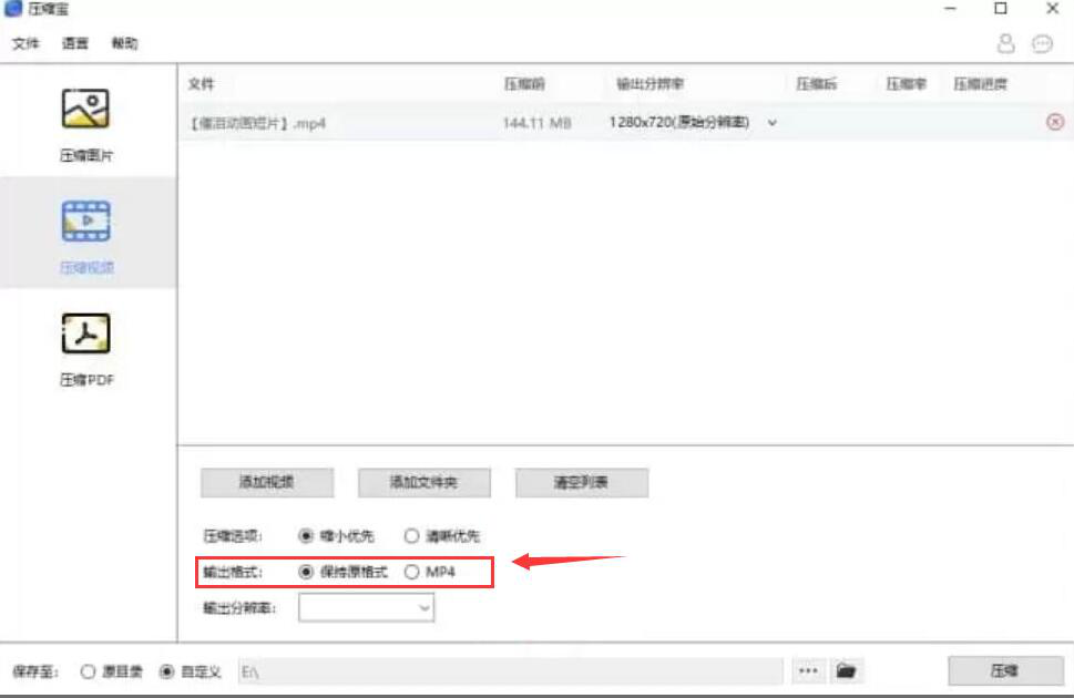 在日常生活中,我们总爱拍视频来记录生活中的点点滴滴,并且将这些视频文件保存到自己的电脑中。可是,当视频太多的时候,就会很占用电脑磁盘空间。那么我们可以使用压缩宝来解决这一问题,因为它拥有批量压缩视频文件的功能。可是没有接触过该软件的用户不了解如何使用压缩宝批量压缩视频文件,所以,本文将为大家讲解压缩宝是怎么批量压缩视频文件的,帮大家节省磁盘空间。 压缩宝如何批量压缩视频文件? 1、首先,用户打开压缩宝,在其主界面的左侧功能栏中点击“压缩视频”。  2、然后,为了使用压缩宝压缩视频文件,用户需要点击“添加视频”的按钮将视频文件导入压缩宝。  3、将视频文件成功导入之后,用户根据自己的需要来设置压缩选项。  4、设置完压缩选项后,接着,设置压缩视频文件输出的格式。  5、压缩选项和输出格式都设置完成后,再根据自己需要来设置输出分辨率。  6、使用压缩宝批量压缩视频文件,还要设置压缩后视频文件的保存路径,如下图所示。  7、最后,用户点击“压缩”23. 赶快让自己乐观快活起来吧,只要你的心理一改变,身体、精神也会随之变化。那样你会得到一种永远向上的力量,这种力量会使你健康而充满活力!的按钮,压缩宝便开始执行压缩视频文件的指令。  -
