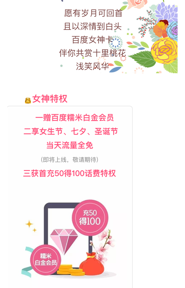 百度继推出百度王卡之后,又新推出了一款百度女神卡,是专为女神们定制的流量超值卡。主打女性用户,绝对是送女友送老婆的绝佳选择,那么百度女神卡资费怎么样呢?怎么申请呢?一起来看看。  百度女神卡怎么申请? 打开“百度糯米”APP,选择已定位城市。  短信验证登陆“百度糯米”APP。 点击糯米APP首页中的“造梦女生”图片链接(美食上方图片)。  在造梦女生页面中找到“百度女神卡”,点击进入。  “点击”现在下单,领取12GB全国流量大礼包”按钮进行申请。  注意事项 入网首次充值50元及以上次日送50元话费,一次到账。 百度女神卡专为广大女神朋友们准备,让你享受更加优惠的流量套餐,而且还有很多专属特权哦。 百度女神卡有什么用? 一、体验特权:“百度女神卡”激活当月免月费,享受套餐内容。 二、首充特权:首次充值50元得100元话费。赠费50元次日到账。 三、“百度糯米”流量特权(即将上线,敬请期待): 1、“百度糯米”APP消费一笔送30MB,“百度女神卡”每月最多可获得450MB。 2、用户每天签到送2MB。累计达到200MB可兑换。 四、“百度地图”流量特权:在“百度地图”APP内连续签到3天送流量,一次送50MB,每月最多送10次,累计达到200MB可兑换。 五、女生节日流量全面特权(即将上线,敬请期待):每年情人节(2月14日)、女生节(3月7日)、七夕节(农历7月初7)、圣诞节(12月25日),当天流量免费(不占用套餐内流量)。 六、流量实惠享:超出套餐国内流量按0.1元/MB计费。“百度女神卡”当月流量使用累计达到10元(即100MB)时,将额外获得924MB免费流量(即10元/1GB)。使用完套内流量,无需自己购买流量包,本套餐自动按照超实惠的10元/1GB进行计费。 七、糯米白金卡会员(即将上线,敬请期待):获赠“百度糯米”白金卡会员41. 说分手的时候不好吵闹。毕竟两个在在一齐那么久,分了他也会难过,只是他比较明智,不想束缚你的或他的明天。好聚好散,以后,还是朋友。权益。 百度女神卡推出,主打女性用户垂一模一样眼高手低露欲滴28. 如果不爱你能够让你幸福,那么我就只是喜爱你。”现今,在农村地区还有很多孩子失学。我认为原因之一就是他们的家庭太贫困,而无法供应他们上学。360.有缘千里来相会,无缘对面不相逢。 芳莲坠粉,疏桐吹绿,庭院暗雨乍歇。无端抱影销魂处,还见篠墙萤暗,藓阶蛩切。送客重寻西去路,问水面、琵琶谁拔?最可惜一片江山,总付与啼鴂。早被婵娟误,欲妆临镜慵。百度女神卡,百度糯米77、Virtue never grows old. |