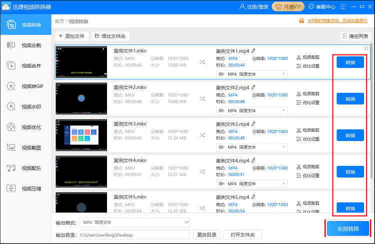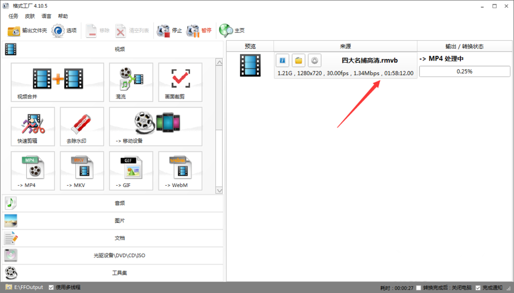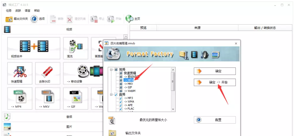 MP4格式一种兼容性极强的音视频文件格式,几乎所有的媒体设备都能播放MP4文件,为了方便,我们有时需要将视频文件转换成MP4格式。本文整理了两种视频格式转换方法,分别用到格式工厂和迅捷视频转换器。 如何将视频文件转换成MP4格式? 方法一、迅捷视频转换器 打开迅捷视频转换器,进入主页,如图,软件支持视频转换、视频分割、视频合并等功能,这里点击【视频转换】,  进入以下界面,点击【添加文件】,导入视频文件,或者直接将文件拖拽到指定区域;如果你需要批量转换视频格式,点击【添加文件夹】,  成功导入视频,如图,点击下方【输出格式】,出现弹窗,选择【视频】——【MP4】——【同原文件】,如果你有其他需求,可以点击【添加自定义设置】,  设置完成,点击【转换】或者【全部转换】,迅捷视频转换器就会将MKV视频转换成MP4格式,耐心等待,  等待进度条到达100%,说明视频转换完成,去到输出目录,即可找到转换之后的MP4视频文件。  方法二、格式工厂 打开格式工厂,进入软件界面,这里是将RMVB视频文件转换成MP4格式,使用鼠标点击文件并将其拖拽到指定区毁于一旦拼音:huǐ yú yī dàn释义:于在;一旦一天。在一天的功夫全被毁掉。多指长期劳动的成果一下子被毁掉。出处:《后汉书·窦融传》百年累之,一朝毁之。”示例:百余年辛苦经营的圆明园,~,更是令人椎心泣血的莫大恨事。★高阳《清宫外史》下册域,然后松开鼠标,  弹出格式转换选择设置对话框,如图,选择MP4格式,设置文件输出路径,点击【确定—开始】按钮,  格式工厂即会自动进行视频转换,耐心等待,转换成功,你可以在专业设备中播放MP4文件。   将视频格式转换为MP4格式的方法还有很多,大家可以试一试。了解更多精彩教程资讯,关注wmzhe.com。 -