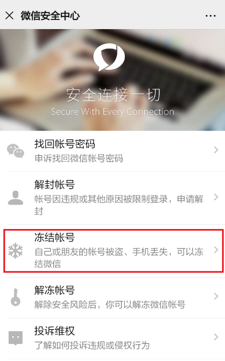 微信是大家都很熟悉的一款社交软件,很多人会将微信绑定银行卡,用于消费转账或者理财,如果微信账号被盗,第一时间应该作何处理?如11. 把每一天过好是最大的幸福,快乐源于每天的感觉良好。总忧虑明天的风险,总抹不去昨天的阴影,今天的生活怎能如意?总攀比那些不可攀比的,总幻想那些不能实现的,今天的心灵怎能安静?任何不切实际的东西,都是痛苦之源,生命的最大杀手是忧愁和焦虑。果微信被盗,请及时冻结账号,以免造成损失,详情请看文章说明。 微信账号被盗应该如何冻结? 打开手机微信,进入界面,点击下方【我】——【设置】,  进入设置界面,如图,点击【账号与安全】选项,然后点击【微信安全中心】,   进入微信安全中心,如图,点击【冻结账号】,一旦遇到微信账号被盗、手机丢失等突发情况,即可冻结微信,   点击【开始冻结】,根据官方提示进行操作,如果后期确认微信账号处于安全状态,可以进行解冻,依然根据提示操作。   另外,由于特殊原因,你想注销微信账号,可以这样操作: 打开微信,进入界面,点击【我】——【设置】——【账号与安全】——【微信安全中心】,选择【注销账号】,   个人申请注销微信账号必须符合官方要求,请仔细阅读,最后点击【注销申请】,根据提示操作即可。  了解更多精彩教程资讯,关注wmzhe.com。 -