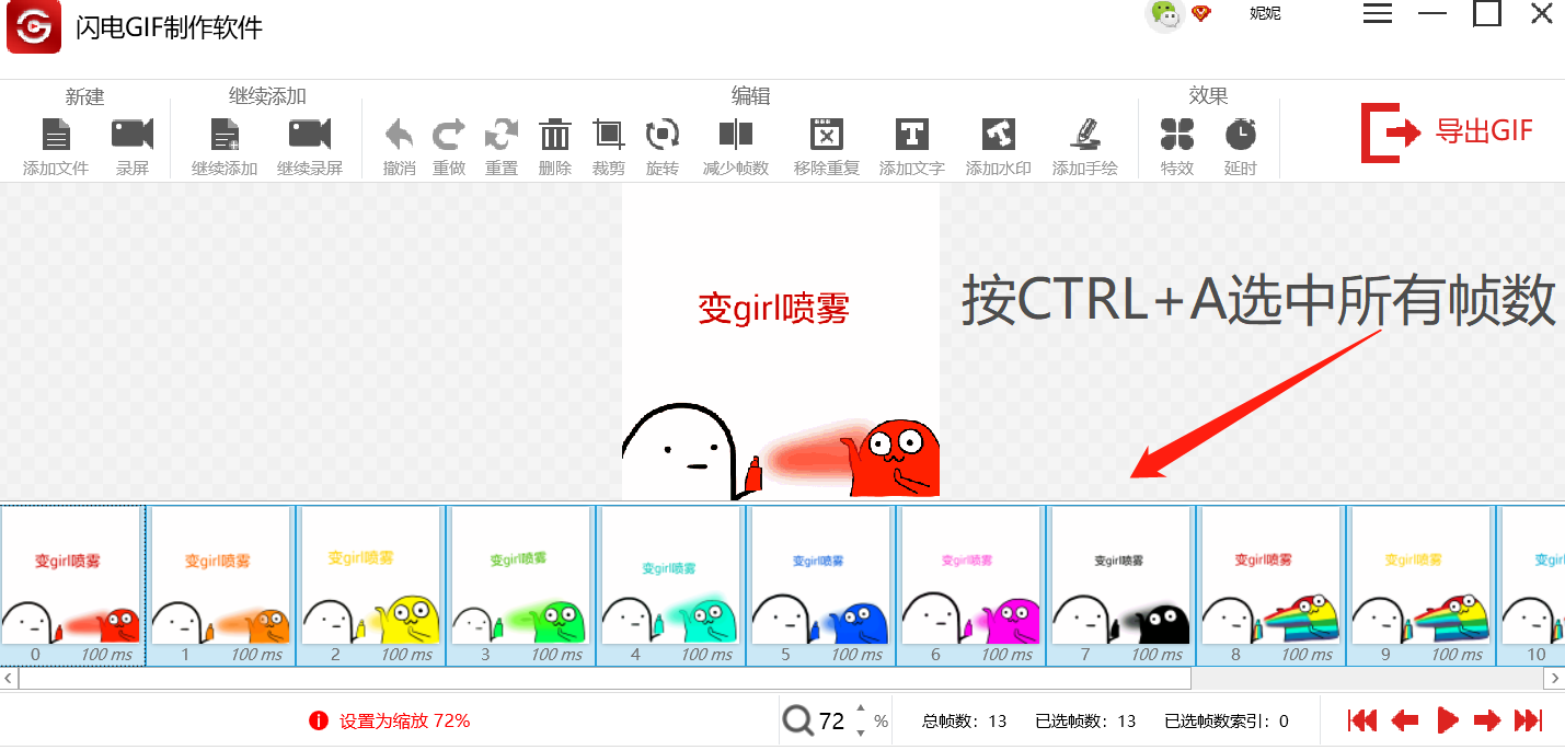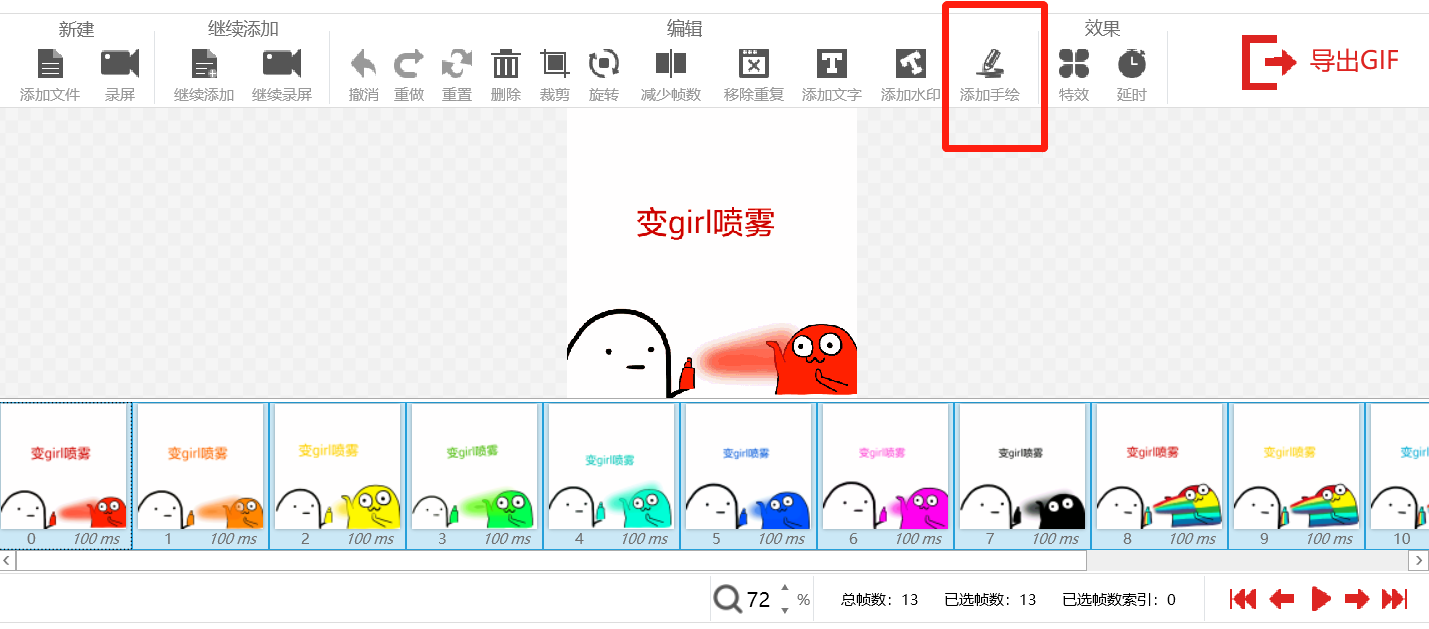 从网上找了一些动图表情包,有小伙伴想要对其进行修改,例如重新添加图片中的文字,从而制作出一个新的表情包,可以做到吗?当然了,小编这里推荐使用闪电GIF制作软件,先将原有文字擦除,再添加新的文本,具体操作如下。 闪电GIF制作软件如何修改GIF图片文字? 下载安装闪电GIF制作软件,打开软件,进入界面,注册登录账号,30. 不是每个人都一定快乐,不是每种痛都一定要述说,不是每件事情都会顺心如意,要知足常乐。风雨过后,方见彩虹!点击【添加文件】,导入GIF动图,   图片添加成功,点按快捷键【Ctrl+A】,选中所有帧数,即可针对表情包进行编辑处理,或者添加效果,  这里先点击【添加手绘】,擦除GIF动图中的文字,弹出小窗口,如图,设置画笔的高度、宽度以及颜色,然后移动鼠标涂抹文字,    涂抹完成,点击确定,效果如图,  现在点击【添加文字】,弹出窗口,输入文字内容,设置字体、字号、颜色以及距离等,点击确定,   处理完成,点击右上角的【导出GIF】,弹出窗口,选择文件类型为GIF,然后设置文件名称和保存路径,点击确定,    软件即会自动处理GIF图片,出现如图提示,说明处理完成,去到目标路径,即可查看表情包效果。  注意,使用闪电GIF制作软件修改图片文字会有一个限制条件,必须确保GIF动图背景是纯色。了解更多精彩教程资讯,关注wmzhe.com。 -