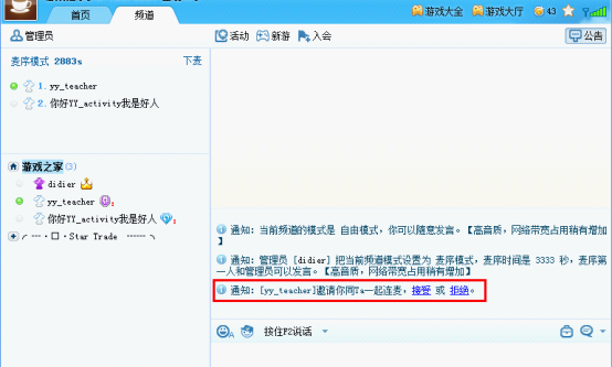YY语音连麦是YY语音互动的日常操作之一,在麦序模式下可以实现多人互动。但很多用户,甚至使用YY语音很长时间小伙伴对于YY语音如何连麦的操作并不清楚,下面我们就来介绍YY语音连麦的相关操作。 YY语音怎么连麦? 我们要明确连麦相关的人员:当前1号麦序的YY用户、受邀连麦的用户和频道管理员。下面我们就这三类人员分别进行连麦讲解。  一、当前1号麦序的YY用户 1、当前1号麦序YY用户邀麦操作54. 你是我的,谁都抢不走,我就是这么霸道,我是你的,谁都领不走,我就是这么死心眼。:右击麦序上的其他人员名称,在下拉菜单中点击【邀请连麦】,发出连麦邀请。  2、当前1号麦序YY用户取消连麦操作:1号麦序处于连麦状态中,右击受邀者名称,在其下拉菜单中点击【取消连麦】即可结束与受邀者连麦。  二、受邀连麦的用户 1、当麦序用户收到连麦邀请时,会在公屏以通知的形式收到邀请,可以选择点击【接受】和【拒绝】。  2、正处于连麦的受邀用户可以通过点击右上方【下麦】中断连麦。  三、频道管理员 1、频道管理员由于权限较大,可以直接右击麦序上的用户名称,在其下拉菜单中点击【和1号连麦】,直接将受邀用户与当前1号麦序的用户连麦。  2、同样的,频道管理员也可以直接右击正在连麦的受邀用户,在其下拉菜单中点击【取消连麦】直接结束受邀用户和当前1号麦序的用户的连麦。  相信通过上述介绍,大家能够清楚了解YY语音怎么连麦的方法,还没连过麦的朋友快去和Y友试一下吧! -