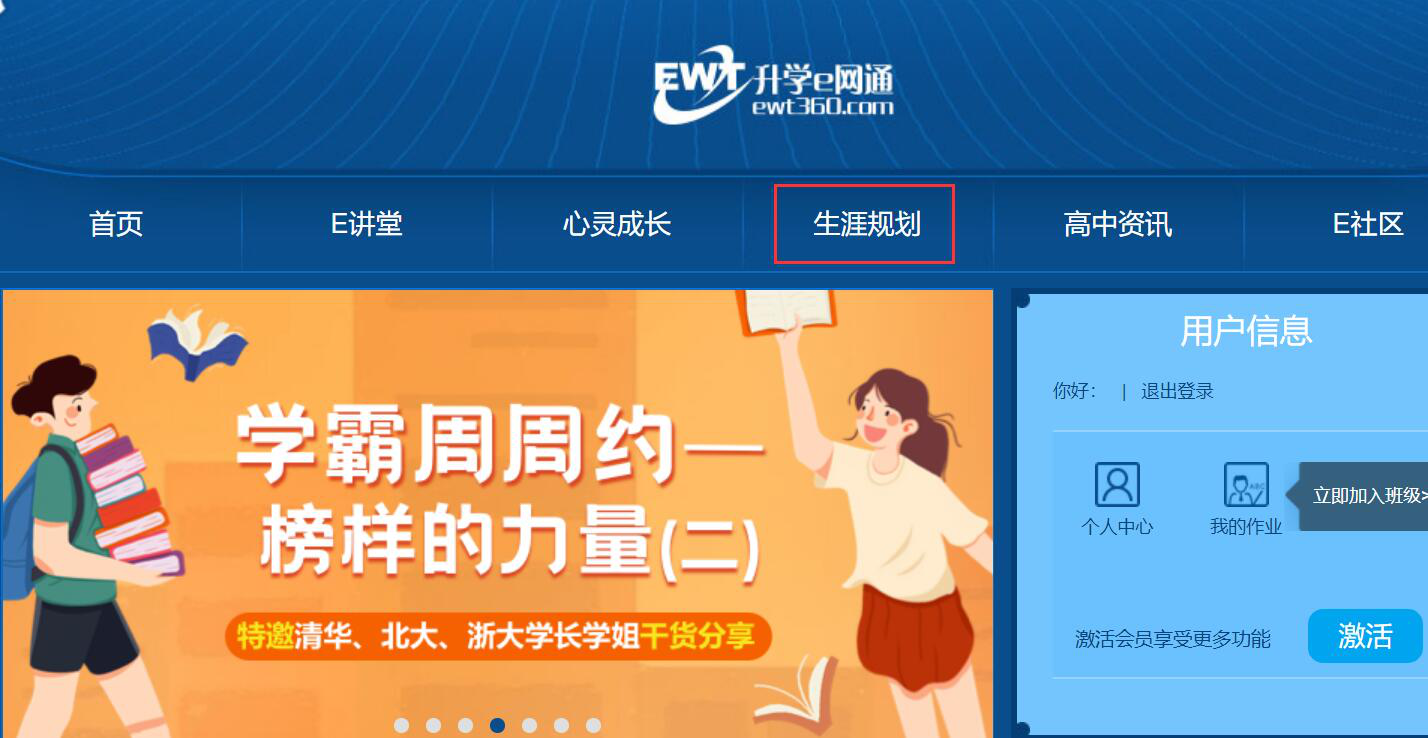 以前我们读高中的时候,除了要规划每个时间段要学习的内容,还要做生涯规划。比如说要选择哪一门学科,要报考哪一所大学。可是做这些生涯规划的时候,往往都只能通过老师的讲解和指导来做出选择,而且往往在做出选择前也未能了解得太详尽。而升学e网通生涯规划却能解决这一问题。对此,很多没有操作过的用户就问到升学e网通生涯规划有什么用?所44. 背叛伤害不了你,能伤你的,是你太在乎。分手伤害不了你,能伤你的,是回忆。无疾而终的恋情伤害不了你,能伤你的,是希望。你总以为是感情伤害了你,其实伤到你的人,永远是自己。以,下面将为大家具体介绍升学e网通生涯规划有什么用处。让升学e网通帮助学子们作出正确的引导,从而作出正确的生涯规划。 升学e网通生涯规划的用处 1、打开升学e网通的官网,输入自己的账号、密码,点击“登录”进入升学e网通。  2、登录成功,可以点击功能菜单的“生涯规划”,从而了解升学e网通生涯规划有什么用处。  3、在升学e网通生涯规划的页面中,可以看到它有很多课程。如果是高中生想做生涯规划,就点击“高中生生涯规划课”。  4、此时,在高中生涯规划课的页面,用户可以在其左侧选择不同的专业进行了解比较,从而为后续选择大学专业作出相关的规划。  5、如果用户对未来的生涯规划感觉头脑空白,那可以切换到升学e网通的生涯测评,进行自我测评,让升学e网通帮助自己做出生涯规划的判断。  6、此外,很多高中生在做生涯规划时,都希望对相关的大学院校能了解更详尽,那就可以在升学e网通中,点击“生涯宝库”从中点击自己想要了解的信息内容进行具体了解。  7、当然了,对于高三的学子来说,都要面临志愿填报。再也不用看那一本厚厚的院校录取信息。做生涯规划选择志愿的时候,在升学e网通中点击“志愿填报”的“历年录取信息”便可以一一了解。  升学e网通生涯规划的用处还是很多的。它能帮助学生更全面了解相关的院校信息、往年录取信息、大学不同专业的信息等等,而这些对学生的生涯规划都是非常有帮助的。 -