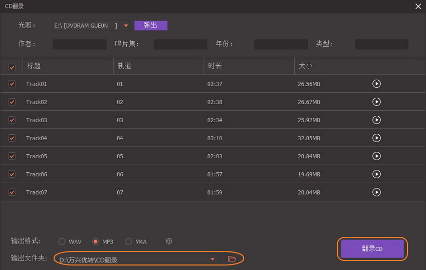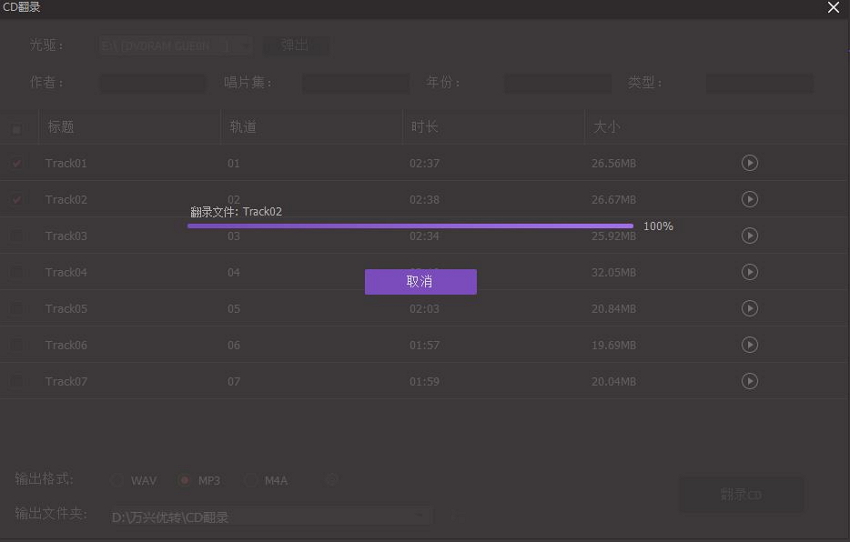 万兴优转是一款多功能的音视频处理软件,支持文件转换、文件压缩、录屏等基础功能,另外还提供了CD翻录功能,可以将CD音乐转换为MP3格式。下文简单介绍了关于万兴优转CD翻录功能的使用方法,有兴趣的小伙伴可以了解。 如何将CD音频转换为MP3格式的文件? 下载安装万兴优转,打开软件,进入界面,如图,点击上方【工具箱】,找到【CD翻录】功能,  点击【CD翻录】,此时会弹出一个窗口,34. 其实,这样的失败根本不足以证明什么,失败只能让咱们真正长大,懂得更多,让咱们成熟起来。能够说,咱们如果不经历失败就难到达成功的彼岸!提示插入CD,将CD连接到电脑,这里会显示所有音频文件,选择需要转换的音频文件,单击播放按钮,进行预览,   在下方点击【输出格式】,选择一种音频格式,然后点击设置按钮,自定义更多参数,例如声音轨道、采样率和比特率,  点击【输出文件夹】,设置文件保存路径,最后点击【翻录CD】,即可将CD转换到音频文件,  转换完成,你会收到通知,去到目标路径,即可找到音频文件,整个过程非常简单。  万兴优转CD翻录功能有一个特点,即不会损坏音频质量,大家可以试一试。了解更多精彩教程资讯,关注wmzhe.com。 -