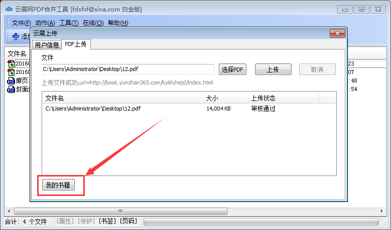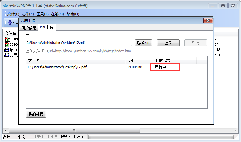 云展网PDF合并工具是一款免费实用的PDF合并工具,它支持几乎所有Windows操作系统,除了输出的PDF合并文件不带任何水印外,它还能将PDF转换成在线电子书保存到云展网上,用户可以通过登录云展网在手机端和PC端随时阅读,十分方便。这么好用的合并工具应该如何使用呢?下面我们就来详细演示。 如何正确使用云展网PDF合并工具? 1、打开云展网PDF合并工具,点击图中【添加】,将需要合并的文件(图片或PDF)添加到列表中。(当然直接拖拽也可以)  2、添加后的文件默认排列顺序决定了合成PDF文件的前后顺序,因此通常需要进行调整。选中某一文件,点击【△】或者【▽】可以调整它的上下位置;点击【移除】,可以删除不想加入的文件。  3、云展网PDF合并工具默认合并的是整个文件,如果用户只需合并部分文件,那么就需要改变文件的合并方式。具体步骤如下: 1)选中需要改变合并方式的文件,点击上方菜单栏中的【动作】,在其下拉菜单中选择【合并算法】。  2)弹出“设置合并算法”窗口,在该窗口中用户可根据自身需要勾选“部分”、“穿插混合页面”、“反向穿插混合页面”或“重复”,设置好之后,点击【确定】。  3、完成以上操作,点击【合并】,在弹出“另存为”窗口中,选择输出文件的保存位置和名称,最后点击【保存】。  4、云展网PDF合并工具能够将PDF免费转换为在线电子书上传到云展网或分享到其他平台(如微信、QQ等)。具体步骤如下: 1) 用户需要注册一个账号并登陆。  2) 登录后,点击【选择PDF】找到需要上传PDF文件。  3)点击【上传】,弹出“上传书籍选项”窗口,在窗口中输入标题,描述等内容,其他一般默认,最后点击【确定】。  4) 上传的PDF文件在下方列表中出现,上传状态处于“审核中”。  5)等待审核通过,然后点击左下角【我的书籍】。  6)便可以在云展网查看电子书或分享发布。  以上就是关于如何使用云展网PDF合并工具的介绍。相信通过本教学,大家可以轻松掌握云展网PDF合并工具的用法,需要的朋友快去试一下吧! 26. 世间万物,满天星辰是你,湖边暖风是你,柳絮飘然是你,道不尽的思念是你。 -