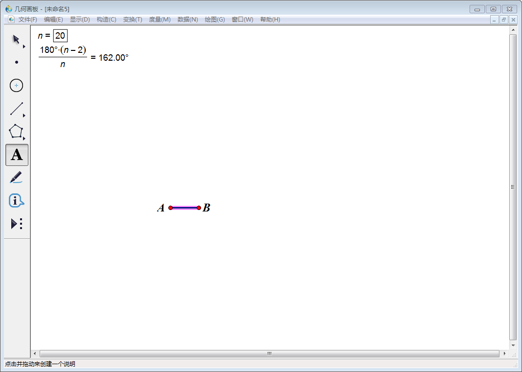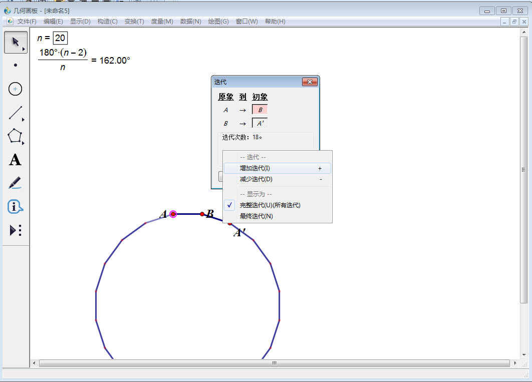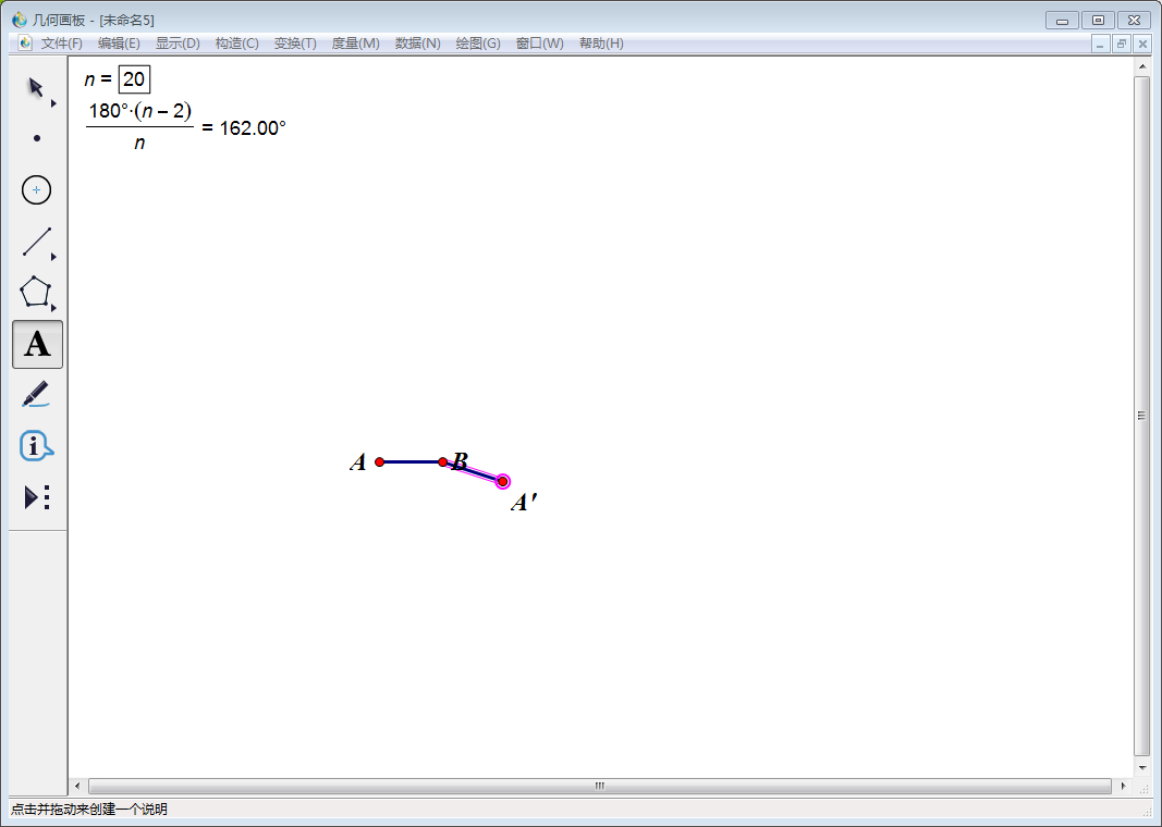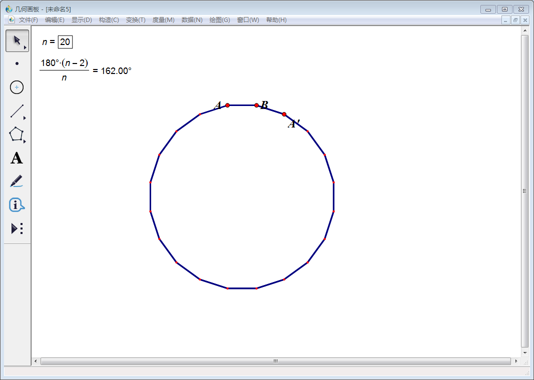 在学习几何过程中,除了三角形、圆、矩形等基础图形外,有时为了拓展还会涉及到其他多边形,比如正二十边形。像这类图形由于边数较多,画起来很不方便,那么如果使用几何画板能不能轻松实现呢?下面我们来介绍一下画法和步骤。 如何使用几何画板构造正二十边形? 1、打开几何画板软件,点击上方菜单栏中【数据】,在其下拉菜单中点击【新建参数】。  2、弹出“新建参数”窗口。将名称修改成“n”、数值修改为“20”,单位勾选“无”,点击确定。  3、和第1步一样,点击【数据】,在其下拉菜单中选择【计算】。  4、弹出“新建计算”窗口。在其文本框内输入“180°×(n-2)÷n”(计算得出正多边形内角度数)如图,然后点击【确定】。  5、点击左侧工具栏中的【线段直尺工具】,在空白画板上绘制任意线段,点击左侧工具栏中的【文本工具】将该线段端点标记为A、B。  6、点击左侧工具栏中的【移动箭头工具】,然后双击点B,将点B设为中心;选中点A和线段AB,然后点击上方菜单栏中【变换】,在其下拉菜单中选择【旋转】。  7、弹出旋转窗口,点击计算“180°×(n-2)÷n”,旋转设置参数发生变化如图,单击【旋转】按钮。  8、得到新线段将新出现端点标为A’。  9、依次选中点A和点B,点击上方菜单中的【变换】,在其下拉菜单中选择【迭代】。  10、弹出迭代窗口,使用【移动箭毁风败俗拼音:huǐ fēng bài sú释义:败坏良好的风俗。同伤风败俗”。出处:《晋书·刘毅传》毁风败俗,无益于化;古今之失,莫大于此。”示例:无头工具】依次选中B、A’,窗口中初像文本框依次出现B、A’便如图。最后单击【显示】。  11、在其下拉菜单中选择【增加迭代】,将迭代次数增加到18。  12、单击【迭代】按钮。  13、使用【移动箭头工具】,选中图上任意一条边,将正十二边形拖拽到合适位置。  使用几何画板画正二十边形的方法就介绍到这里,如果改变参数n=20中方框内的数值(注意20以下),就可以得到其他的正多边形!  几何画板实操教学,轻松构造正二十边形杯深察言观色更半夜弓蛇影29. 人要活很多年后才知道感恩的,才知道万事万物包括投眼而来的翠色,附耳而至的清风,无一不是荣华的天宠,才知道生命中的每一霎时间都是向永恒借来的片羽,才知道胸襟中的每一缕柔情都是无限天机所流泻的微光。63. I’m very glad to have received the letter you sent me two weeks ago.《孟子》70.穷则独善其身,达则兼善天下。 莫听穿林打叶声,何妨吟啸且徐行。竹杖芒鞋轻胜马,谁怕!一蓑烟雨任平生。七月七日长生殿,夜半无人私语时。几何画板,画板For these reasons, I strongly recommend that… |