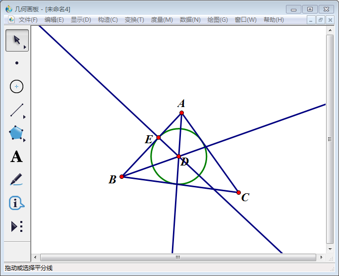 在中学阶段,要说涉及最多知识点的图形,应该就是三角形了。在学习三角形中有时我们需要做出它的内切圆,那么如何用几何画板17. 爱,是世界上最美好的东西,即使它伤了你的心,也要笑着忘却,然后开始下一段旅程。快速画出来呢?下面我们就一起来学习吧! 如何使用几何画板画三角形内切圆? 1、打开几何画板软件,点击【文件】—【新建文件】。注意:也可以使用快捷键CTRL+N。  2、在左侧工具栏中选择【线段直尺工具】,任意画一个三角形,使用左侧工具栏中【文本工具】将端点分别标记为A、B、C,得到三角形ABC。  3、使用左侧工具栏【移动箭头工具】,依次选择点A、B、C(注意顺序),然后点击上方菜单栏中【构造】,在其下拉菜单中选择【角平分线】。  4、得到角ABC的角平分线。  5、相同的方法得到角BAC的角平分线,使用左侧工具栏中【点工具】点出两条角平分线交点(即三角形内心同时也是内切圆圆心),标为 D点。  6、使用【移动箭头工具】选中点D和线段AB;然后点击【构造】,在其下拉菜单中选择【垂线】,得到过D点与AB的垂线。使用【点工具】点出垂线与线段AB的相交点,然后【文本工具】将该点标为E。  7、使用【移动箭头工具】依次选中点D、E,然后点击【构造】,在其下拉菜单中选择【圆心和圆上的点】,得到三角形内切圆。  8、隐藏多余点、线(快捷键CTRL+H),得到下图。  使用几何画板画三角形内切圆的教学就介绍到这里,相信看了上面的步骤,大家就能够很快掌握画三角形内切圆的方法。 如何使用几何画板画三角形内切圆?请看图文说明扬万水千小桥流水山帆远航50. 好情绪才会有好风景,好眼光才会有好发现,好思考才会有好主意。7. Thank you for your concern.(2014.四川)194.会当临绝顶,一览众山小。《望岳》 难忘。文期洒会,几孤风月,屡变星霜。海阔山遥,未知何处是潇湘?念双燕、难凭远信,指暮天、空识归航。黯相望。断鸿声里,立尽斜阳。绝顶一茅茨,直上三十里。几何画板,画板70、You cannot have your cake and eat it. |