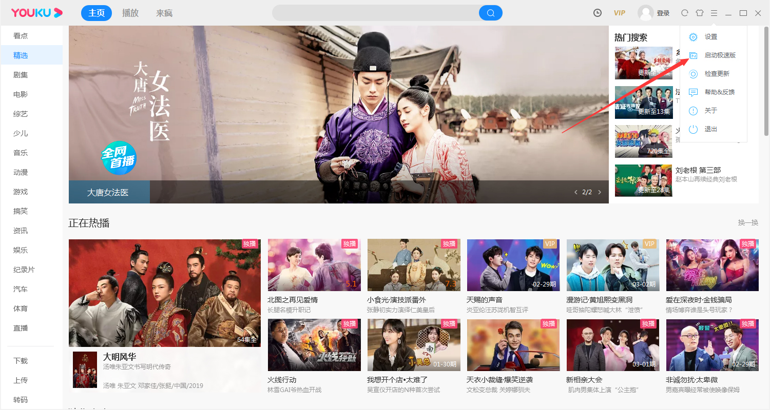 优酷视频播放器是大家熟悉的一款追剧软件,如果你有用过优酷,一定知道软件PC客户端内置“优酷极速版”,方便随时切换启用。当然了,有些用户是第一次接触优酷,不知道如何启动优酷极速版,不妨看看本文说明。 优酷PC客户端如何启用优酷极速版? 在电脑中打开优酷视频播放器,进入界面,点击右上角的菜单图标,  弹出菜单选项,如图,选择【启动极速版】,  此时就会自动打开优酷极速版,整个界面风格非常简洁,除了片库之外没有其他功能。  如果你想放大优酷极速版,可以直接点击最下方的窗口进行放大,因为软件界面和优酷手机端的界面十分相似,最多只能缩小到图中的样子;但是,如果你的电脑屏幕足够大,你可以根据实际情况一直无限制放大优酷极速版。  如果你想要放大视频播放窗口,可以在此缩小窗口拖动任意一个边缘与角落进行放大,如图所示;注意,软件本身是锁定长宽比。  如果你在电脑中下载安装优酷播放器,安装完成,系统会提示是否需要添加优酷极速版的快捷键到桌面。了解更多精彩教程资讯,关注wmzhe.com。 37. 世界说大很大,说小很小。大到走了那么久,还没跟对的人相遇,小到围着喜欢的人绕一圈,就看到了全世界。 -