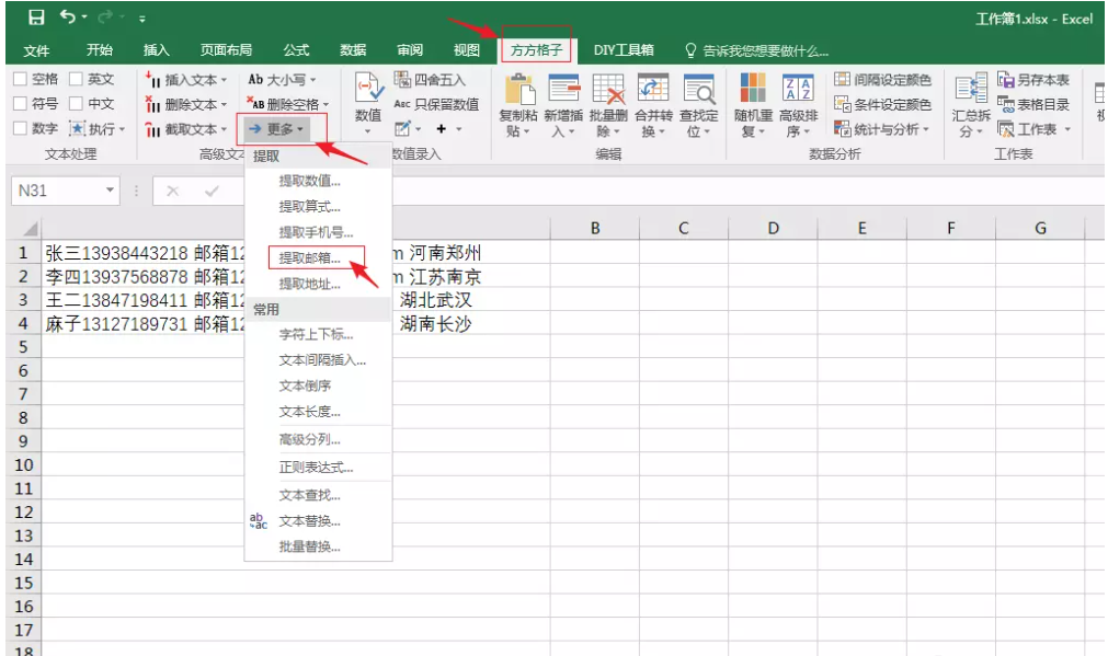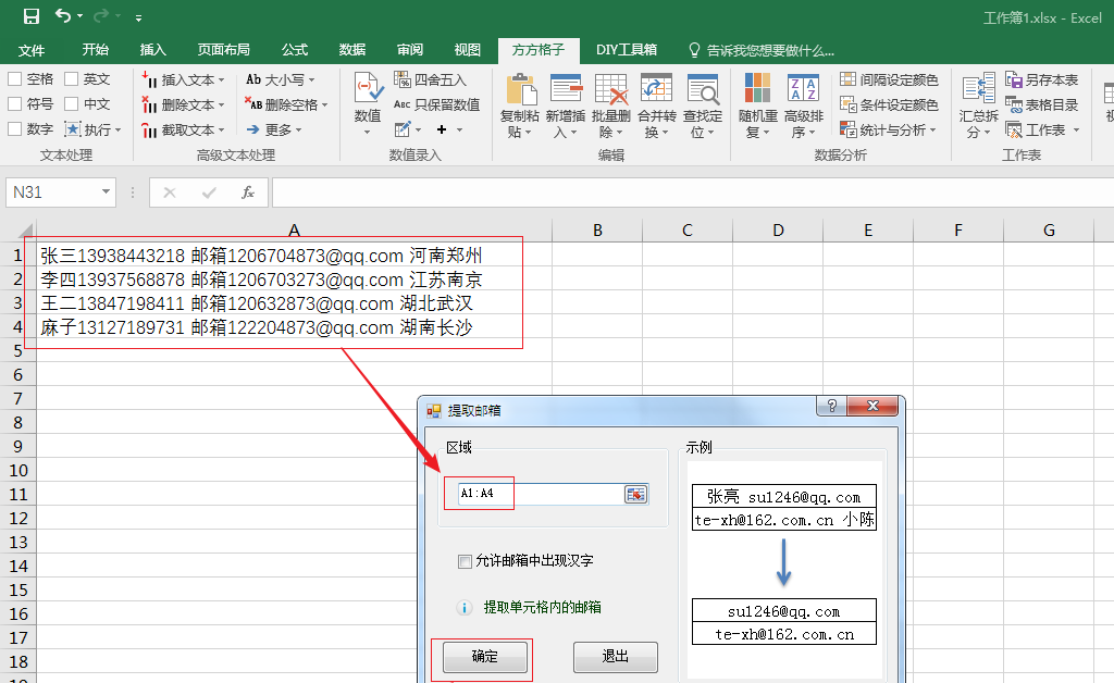 日常工作生活中,很多人习惯使用Excel表格来统计数据,为了提高效率,大家除了学习一些关于数据处理的小技巧,也不能忽略各种强大的插件。今天小编就来介绍一款非常实用的Excel插件——方方格子,快来了解它的功能作用! 简单了解方方格子的功能作用 准备工作:首先下载安装Excel插件——方方格子,插件体积很小,安装简单,这里不做详细说明。 作用一、记录鼠标停留位置 Excel表格中的数据太多了,很容易出现混乱,同事喊你说了几句话,你就忘了之前的工作进度,还要思考半天!有了方方格子,你就可以知道鼠标之前的停留位置,是不是很贴心? 1、打开一个Excel工作簿,如图,在上方菜单栏中依次点击【方方格子】——【视图】——【记忆】选项,即可打开鼠标的记忆功能,  2、如图,通过点击【←】、35. 如果当初我勇敢,结局是不是不一样。如果当时你坚持,回忆会不会不这样。【→】这两个箭头,即可查看鼠标停留在哪个单元格或者区域。  注意,开启记忆功能之后,鼠标在此之前的移动位置也可以被找到,但是,记忆功能只能记忆最近几次的鼠标位置。 作用二、标注相同单元格 看着表格中的一堆数据真是头都大了,如果每次点击一个单元格即会标记与之相同的单元格,看起来就会方便多了。 1、打开Excel表格,如图,依次点击【方方格子】——【视图】——【关注相同值】,此时点击某个单元格,与之相同的单元格就会被高亮显示,   2、如果你想要修改高亮显示颜色,可以点击【关注相同值】——【设置】,弹出面板,选择自己喜欢的颜色,进行确定。   注意,启用关注相同值功能,相同单元格只是被暂时高亮,单元格本身的填充格式不变。 作用三、提取邮箱地址 整理统计员工信息,为了排版清晰、方便查看,需要将个人邮箱提取处理,有什么好的方法呢? 1、打开Excel表格,如图,在菜单栏中依次点击【方方格子】——【高级文本处理】——【更多】——【提取邮箱】,  2、弹出对话框,如图,选择需要提取数据的单元格区域,点击【确定】,  3、现在选择存放提取结果的单元格,点击确定,即可成功提取邮箱地址。   注意,必须确保邮箱格式正确,如果原始数据被修改了,提取结果无法实现自动同步。 关于方方格子插件的功能还有很多,大家可以自行尝试体验。了解更多精彩教程资讯,关注wmzhe.com。 -