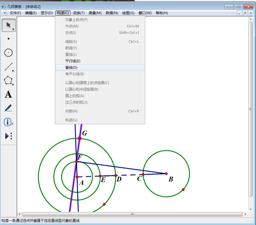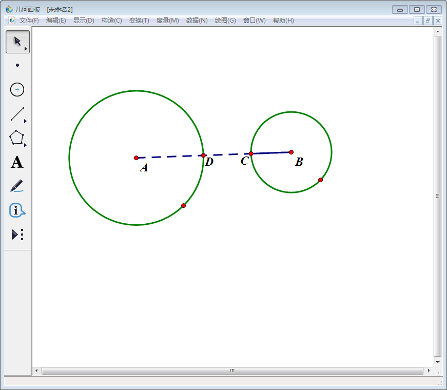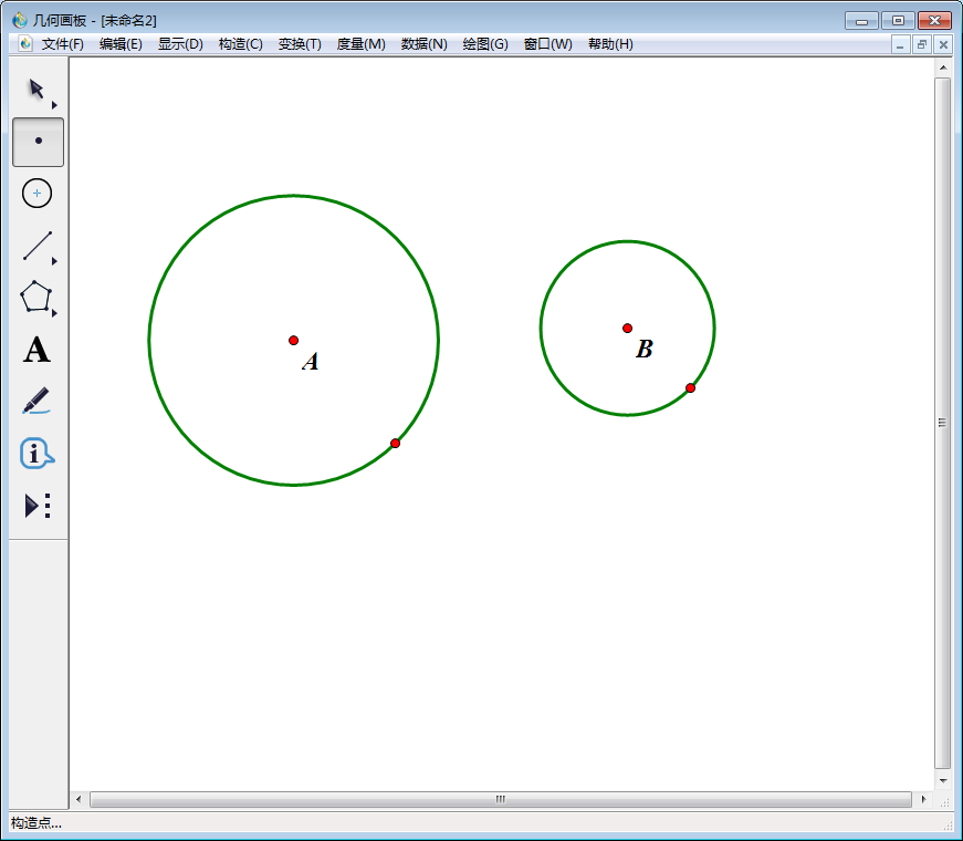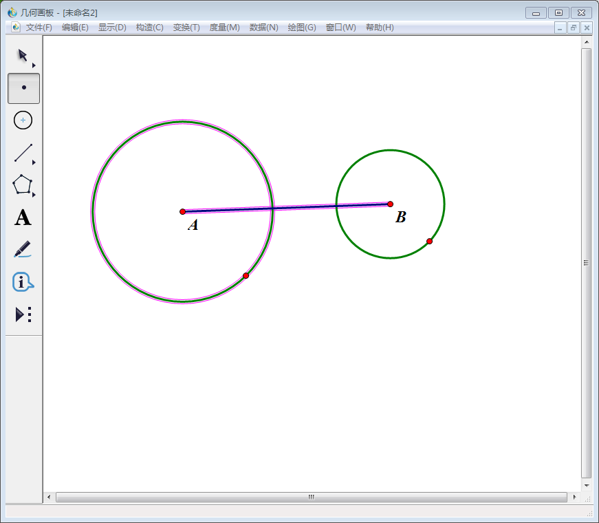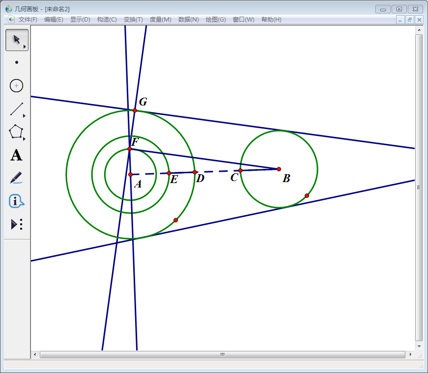 在圆的相关知识点考察中常常会有涉及两个圆外公切线的题目,那么在几何画板上如何绘制呢?今天我们就来讲解一下。 如何利用几何画板画两圆的公切线? 1、打开几何画板软件,选择左侧工具栏中的“圆工具”,绘制两个相离的圆:圆心分别标为A、B。  2、使用左侧工具栏中的“线段直尺工具”画线段AB。  3、使用左侧工具栏中的“线段直尺工具”连接BC。  4、使用左侧工具栏中“移动和选择工具”选中点A、线段AB,然后点击上方菜单栏中“构造”,在其下拉菜单中选择“垂线”。  得到AB的垂线。  5、再次选中A点及线8. 我不敢说我是,世界上最爱你的人,但我敢说你是我最用心爱的人。段BC,然后点击上方菜单栏中“构造”,在其下拉菜单中选择“以圆心和半径绘圆”。  得到一个以A圆心,BC线段长为半径的新圆,该圆于线段AB交点标为E。  6、使用左侧工具栏中“线段直尺工具”连接DE,使用“移动选择工具”选中A点及线段DE,然后点击上方菜单栏中“构造”,在其下拉菜单中选择“以圆心和半径绘圆”。  得到A为圆心,DE为半径的新圆,该圆与垂线交点标为F。  7、使用左侧工具栏中“线段直尺工具”连接BF,然后使用“移动选择工具”选中线段BF和点F,然后点击上方菜单栏中“构造”,在其下拉菜单中选择“垂线”。  8、使用“移动选择工具”选中过点G的垂线和点G,然后点击上方菜单栏中“构造”,在其下拉菜单中选择“垂线”。  9、双击线段AB将其标记为旋转中心,选中公切线,然后点击上方菜单栏中“变换”,在其下拉菜单中选择“反射”。  于是得到另一条外公切线。  10、隐藏不必要线段和点,得到如下图形。  好了,使用几何画板画两圆外公切线的教程到这里就演示完了。通过这个教程的练习,相信大家对于几何画板中的“构造”命令会有深刻的认识。 -