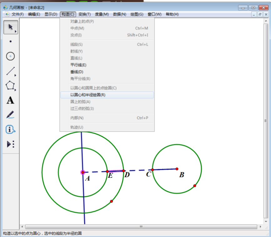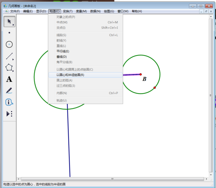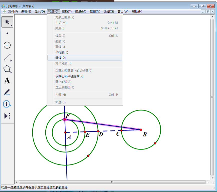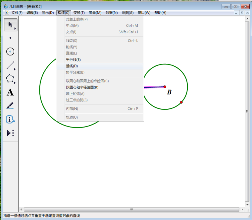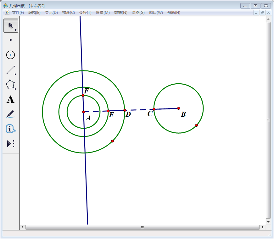 在圆的相关知识点考察中常常会有涉及两个圆外公切线的题目,那么在几何画板上如何绘制呢?今天我们就来讲解一下。 如何利用几何画板画两圆的公切线? 1、打开几何画板软件,选择左侧工具栏中的“圆工具”,绘制两个相离的圆:圆心分别标为A、B。  2、使用左侧工具栏中的“线段直尺工具”画线段AB。  3、使用左侧工具栏中的“线段直尺工具”连接BC。  4、使用左侧工具栏中“移动和选择工具”选中点A、线段AB,然后点击上方菜单栏中“构造”,在其下拉菜单中选择“垂线”。  得到AB的垂线。  5、再次选中A点及线8. 我不敢说我是,世界上最爱你的人,但我敢说你是我最用心爱的人。段BC,然后点击上方菜单栏中“构造”,在其下拉菜单中选择“以圆心和半径绘圆”。  得到一个以A圆心,BC线段长为半径的新圆,该圆于线段AB交点标为E。  6、使用左侧工具栏中“线段直尺工具”连接DE,使用“移动选择工具”选中A点及线段DE,然后点击上方菜单栏中“构造”,在其下拉菜单中选择“以圆心和半径绘圆”。  得到A为圆心,DE为半径的新圆,该圆与垂线交点标为F。  7、使用左侧工具栏中“线段直尺工具”连接BF,然后使用“移动选择工具”选中线段BF和点F,然后点击上方菜单栏中“构造”,在其下拉菜单中选择“垂线”。  8、使用“移动选择工具”选中过点G的垂线和点G,然后点击上方菜单栏中“构造”,在其下拉菜单中选择“垂线”。  9、双击线段AB将其标记为旋转中心,选中公切线,然后点击上方菜单栏中“变换”,在其下拉菜单中选择“反射”。  于是得到另一条外公切线。  10、隐藏不必要线段和点,得到如下图形。  好了,使用几何画板画两圆外公切线的教程到这里就演示完了。通过这个教程的练习,相信大家对于几何画板中的“构造”命令会有深刻的认识。 -