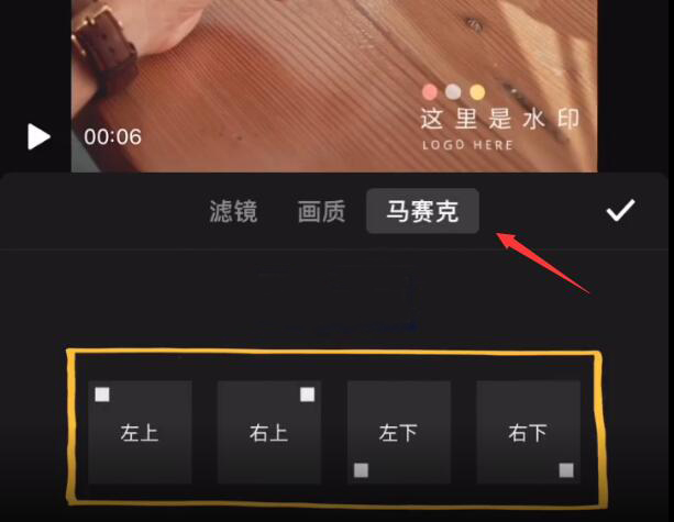 平时为了工作上推广的需要,我们常常会在网上下载一些相关的视频。可是下载的视频往往都是有水印的,让人很是苦恼。为了避免侵权和达到更好的推广效果,可以利用快剪辑去除视频的水印。可是很多人都不了解具体的方法,所以,本文将为大家讲解快剪辑如何去除视频水印,帮助大家得到更干净的视频。 快剪辑如何去除手机视频水印? 1、首先,用户将需要去除水印的视频导入到手机版的快剪辑。  2、然后,在快剪辑中,点选该视频素材并点击其上方功能栏中的“画质”。  3、接下来,在快剪辑的画质操作界面中,点击切换到马赛克功能。用户可以看到它有四个不同的马赛克方向,非常人性化。  4、因为该视频中,水印是在右下方。所以,这里,点击“右下”的马赛克,可以发现在视频的右下方便会出现马赛克的选区。用户可以通过拉伸选区来调整需要去除视频水印的区域。  5、随后,在快剪辑中,长按该视频素材并拖拽视频尾部来调整时长。这样快剪辑就可以去除整个视频的水印。  6、当快剪辑去除视频水印后,点击“下一步”按钮。  7、最后,点击右上方的“生成”按钮,选择视频输出的清晰度。快剪辑便将去除了水印的视频自动保存到手机相册。 15. 东西虽然丢了,就算它再珍贵又有何防,毕竟咱人是好好的,懂吗?这叫“留着青山在,不怕没柴烧”。希望这件事情不会再影响到你的心情。 快剪辑在去除视频水印的过程中,建议用户根据视频水印的位置来选择马赛克的方向,这样一来,利用快剪辑去除视频水印才更高效。 -