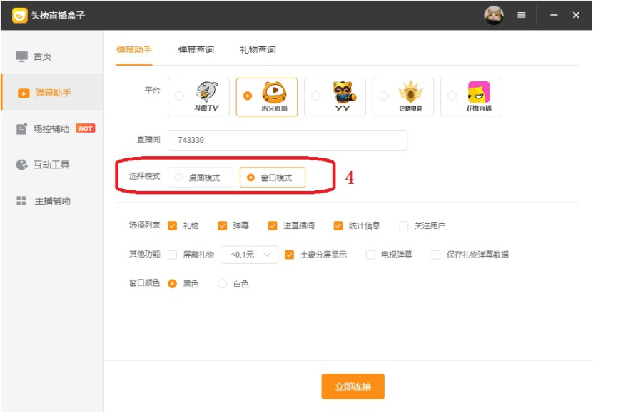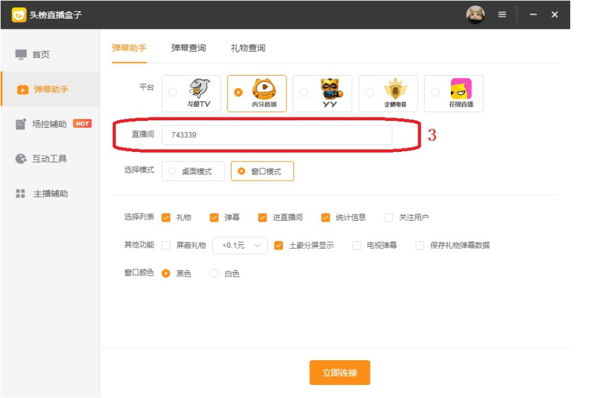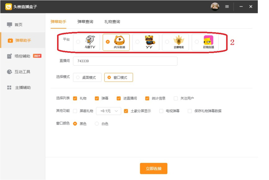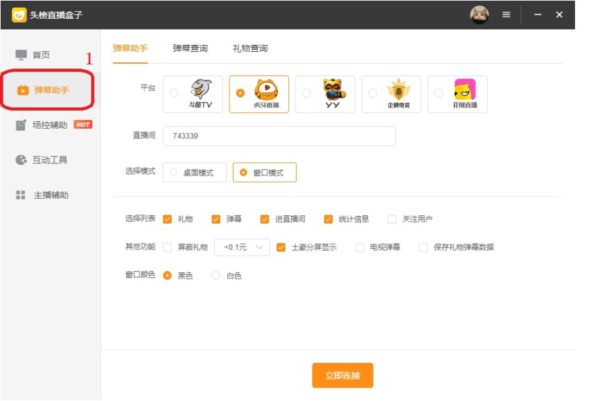 头榜直播盒子是一款支持斗鱼、虎牙、yy、企鹅电竞和花椒直播等多个平台的直播辅助工具,该软件通过分析数据来帮助主播提高直播质量,以获得更多关注。今天我们来简单介绍一下头榜直播盒子的使用教程。 如何使用头榜直播盒子提升直播质量? 1、登录头榜直播盒子之后,选择平台类型,点击【授权登录】。  2、弹出直播平台的登录页面,输入用户直播平台账号(这里是虎牙账号),点击【登录】。 注意:为了能够使用直播间的禁言等操作,最好登录有房间管理权限的账号。  3、成功登录直播账号后,头榜直播盒子会显示登录账号名称和管理权限。  4、点击左侧【弹幕助手】,  5、在右侧“平44. 背叛伤害不了你,能伤你的,是你太在乎。分手伤害不了你,能伤你的,是回忆。无疾而终的恋情伤害不了你,能伤你的,是希望。你总以为是感情伤害了你,其实伤到你的人,永远是自己。台”选项中选择要进入的直播平台。  6、然后“直播间”选项后文本框内中输入要连接的房间号码。  7、在“选择模式”选项后选择桌面模式或窗口模式。  1)桌面模式特点是比较灵活,进入直播间后,直播盒子根据选择列表拆分为若干模块,主播可以根据个人习惯来调整每个模块的位置、显示关闭和透明度。  2)窗口模式特点是模块放在固定位置,不需要主播进行调整。  8、然后根据需要选择配置选项,最后点击【立即连接】即可进入直播间开始直播。  注意:如果选择桌面模式,它的配置选项和窗口模式略有差异。  以上就是关于头榜直播盒子使用教程的介绍,简单来说,它确实是一款不错的直播辅助工具。了解更多精彩教程资讯,关注wmzhe.com。 -