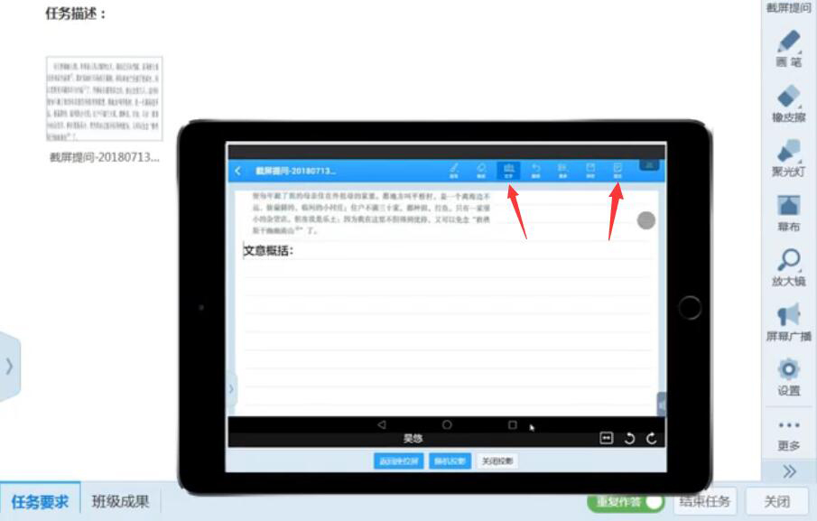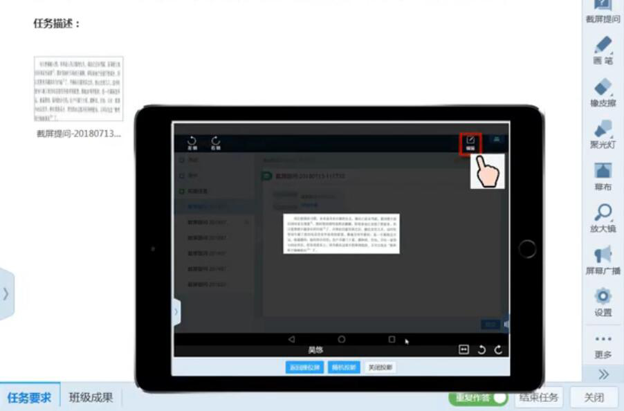在日常课堂中,为了锻炼学生的概括总结能力,老师在课堂上,经常会要求学生概括某个段落或者某篇文章的大意。可是,在提问的时候,经常发现很多学生不愿意主动作答,学习上比较被动。而AiClass截屏提问功能则可以帮助老师解决这一问题。通过AiClass截屏提问,激发学生积极参与作答。很多刚接触AiClass的老师反映不懂怎么操作,所以,下面来分享AiClass截屏提问使用教程,实现互动教学。 如何使用AiClass截屏提问功能? 1、首先,老师登录AiClass,在授课界面右侧工具栏点击“截屏提问”按钮,从而进入AiClass截屏提问环节。  2、然后,按住鼠标左键点选需要学生概括的某个段落,选好后松开鼠标,即会出现如下图的提示,老师点击“全班推送”按钮,AiClass便执行将该段落推送至学生端平板的指令。  3、此时,会弹出正在推送的界面提示,当推送完成后,点击“寸草春晖拼音:cùn cǎo chūn huī释义:寸草小草;春晖春天的阳光。小草微薄的心意报答不了春日阳光的深情。比喻父母的恩情,难报万一。出处:唐·孟郊《游子吟》诗谁言寸草心,报得三春晖。”示例:~无根处,枉教丹桂吐奇芬。★清·方成培《雷峰塔·祭塔》关闭”按钮。  4、接下来,学生端登录AiClass后,便会收到老师推送的提问任务,作答时,点击其界面右上方的“编辑”按钮。  5、接下来,学生端登录AiClass后,便会收到老师推送的提问任务,作答时,点击其界面右上方的“编辑”按钮。  6、最后,当学生将任务提交后,老师便可以在“班级成果”中查看各位学生的作答情况。老师可以将学生的答题情况添加至“讲解库”进行对比讲解,点击“结束任务”按钮即可结束AiClass截屏提问环节。  AiClass截屏提问功能使用过程中,老师可以针对学生的作答情况来了解学生对某个知识点的理解程度和总结能力。如果老师觉得学生的作答情况很不理想,可以设置重复作答,让该学生拥有再次作答的机会。了解更多精彩教程资讯,关注wmzhe.com。 -