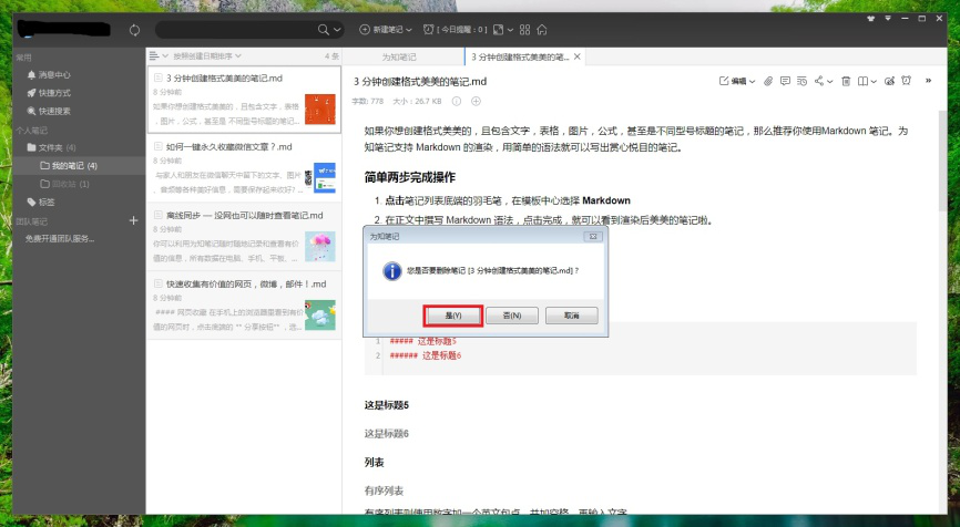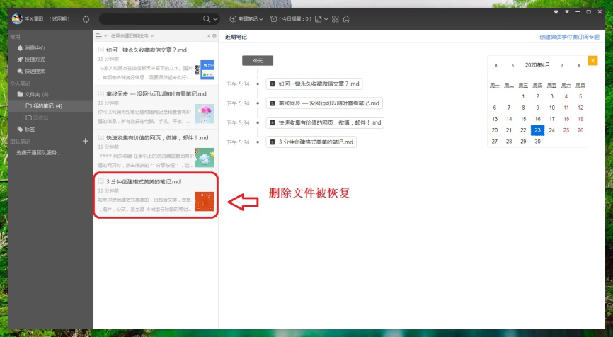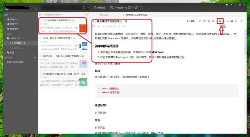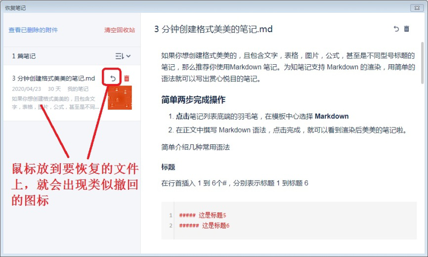为知笔记是目前国内唯一一款“工作笔记”的云笔记类软件,虽然实用性很强,但很多用户对为知笔记软件并不了解。今天我们来介绍一下为知笔记怎么恢复垂泽昆拼音:chuí yù hòu kūn释义:裕富足◇昆子孙,后代,后嗣。为后世子孙留下功业或财产。出处:《书·仲虺之诰》以义制事,以礼制心,垂泽昆。”示例:~,流名竹帛,此实生平之志也。★《梁书·侯景传》已删除的笔记。 为知笔记如何恢复已删除的笔记? 1、打开为知笔记软件,选择任一笔记(这里以“3分钟创建...”为例),然后点击右侧删除图标(如图)。  2、在弹出的“您是否要删除...”对话框中点击【是(Y)】,这样笔记就被删除了。  3、接着我们来恢复刚刚删除的笔记“3分钟创建...”。首先点击左上角用户头像,在下拉菜单中依次选择【维护】—【恢复已删除笔记】。  4、进入“恢复笔记”对话框,找到刚刚删除的笔记“3分钟创建...”,将鼠标放到左侧笔记简介上,出现撤回和删除两个图标,选择点击撤回图标(如图)。  5、已删除笔记就被恢复了。点击窗口右上叉号,关闭窗口。  6、回到为知笔记主界面,在如图空白处右击,在弹出下拉菜单中选择【刷新】。  7、如图删除的笔记“3分钟创建...”被成功的恢复到笔记列表中。  以上就是关于为知笔记怎么恢复已删除笔记的方法介绍,了解更多精彩教程资讯,关注wmzhe.com。 -