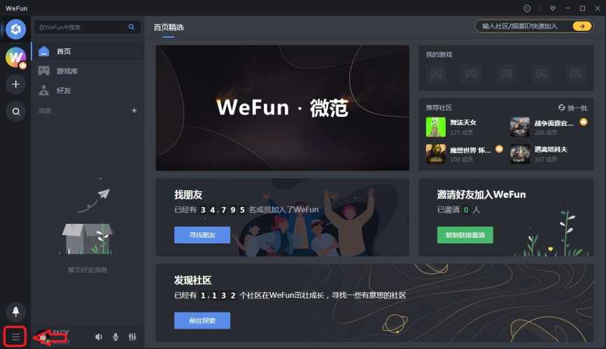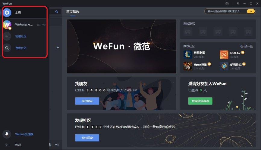 WeFun语音平台是一款深受国内用户喜爱的游戏开黑交友的语音聊天软件。该软件给用户提供高质量的在线清晰语音服务,为用户开黑游戏和交友创造了良好的平台条件。今天我们就40. 抱怨是一种致命的消极心态,一旦自己的抱怨成为恶习,那么人生就会暗无天日,不仅自己好心境全无,而且别人跟着也倒霉。抱怨没有好处,乐观才最重要。来介绍一下WeFun语音平台的功能。 WeFun语音平台具备哪些功能? 1、注册并登录WeFun语音平台。  2、进入WeFun语音平台客户端界面。点击左下方“三”字图标。  3、可以看到WeFun语音平台左侧主要有5个功能选项:主页、WeFun官方社区、创建社区、搜索社区和WeFun加速器。  4、点击【主页】选项。这里主要显示用户的游戏、社区、好友的信息。  点击【好友】选项,你可以搜索添加用户的好友,也可以绑定微信、QQ实现信息同步。  5、点击【WeFun官方社区】选项。这里发布有软件的介绍和使用指南、社区创建的指南、官方公告和游戏资讯。  6、点击【+】选项,然后“添加社区”的弹窗内选择点击【创建社区】或【加入社区】。注意:加入社区需要邀请码。  7、点击放大镜图标打开社区搜索(如图),接着在右侧搜索栏文本框中输入用户感兴趣游戏或话题关键字,然后点击【搜索】,即可找到目前相关社区进行交流讨论。  8、点击小火箭图标,打开游戏加速器(如图)。软件免费提供了9小时的免费加速时间,用户可以通过邀请好友、完成每日任务来延长游戏加速器的使用时间。  点击游戏加速器中的【全部游戏】,将鼠标放在需要添加的游戏图标上,然后点击出现的【添加游戏】选项即可成功添加游戏到加速器。  9、其他功能。点击右上角用户设置图标,打开WeFun设置。在这里用户可对用户资料、账号信息等进行设置修改。   以上就是关于WeFun语音平台功能的介绍,了解更多精彩教程资讯,关注wmzhe.com。 WeFun语音平台具备哪些功能?带你进行初步了解话儿闻鸡起舞多(滔滔不绝天经地义)13. 保持友谊的最好办法就是任何事情也不假手于他,同时也不借钱给他。我写信是为了了解更多去伦敦旅行的信息。184.此曲只应天上有,人间能得几回闻。《赠花卿》 池上红衣伴倚阑,栖鸦常带夕阳还。殷云度雨疏桐落,明月生凉宝扇闲。021王昌龄:同从弟南斋玩月忆山阴崔少府WeFun,语音,加速器,游戏加速器55、All time is no time when it is past. |