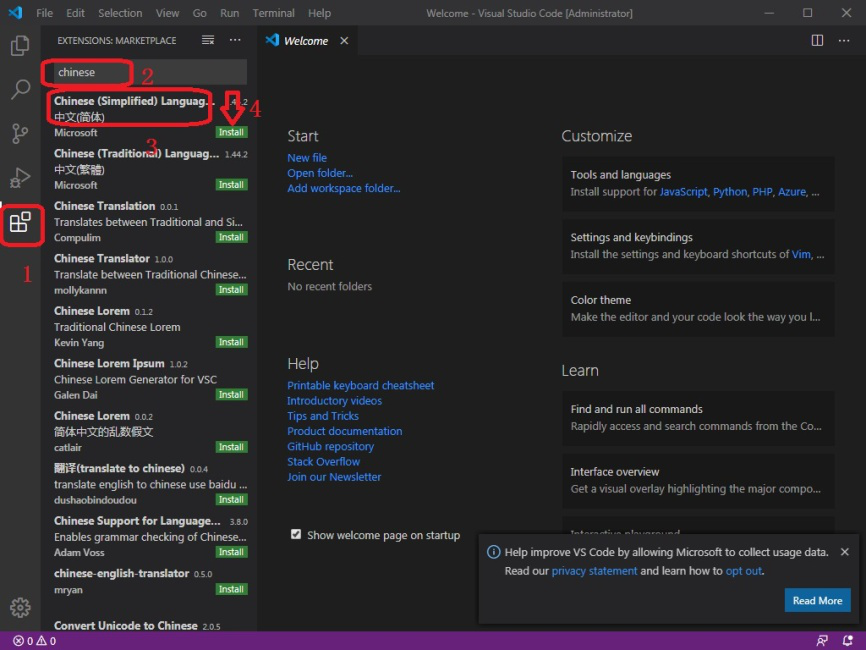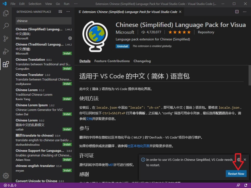 visual studio code(以下简称VS code)是一款非常实用的代码编辑器软件,由于其完全免费、开源、轻量化和跨平台的优点,深受编码用户的欢迎。有些国内用户反映由于其安装版本为全英文,使用起来很不方便,今天我们演示一下VS code软件如何改成中文界面。 如何将visual studio code软件语言设置成中文? 1、点击桌面图标,打开VS code软件。  不知道如何下载的朋友,可以点击https://www.wmzhe.垂头搨翼拼音:chuí tóu dá yì释义:形容受挫后萎靡不振的样子。出处:汉·陈琳《为袁绍檄豫州文》方畿之内,简练之臣,皆垂头搨翼,莫所凭持。”示例:无com/soft-40022.html下载安装。 2、如图所示,首先点击扩展选项(图中标识为“1”),接着在搜索栏中输入“chinese”或“language” (图中标识为“2”),然后找到“Chinese(Simplified) language ...(中文简体)”,最后点击后面的【install】(意为“安装”)。  3、软件右侧出现如图界面,点击下方【Restart Now】(重启软件)。  4、软件界面就变成中文简体了。  以上就是关于设置VS code代码编辑器语言为中文的方法介绍,是不是很简单,快去试试吧! -