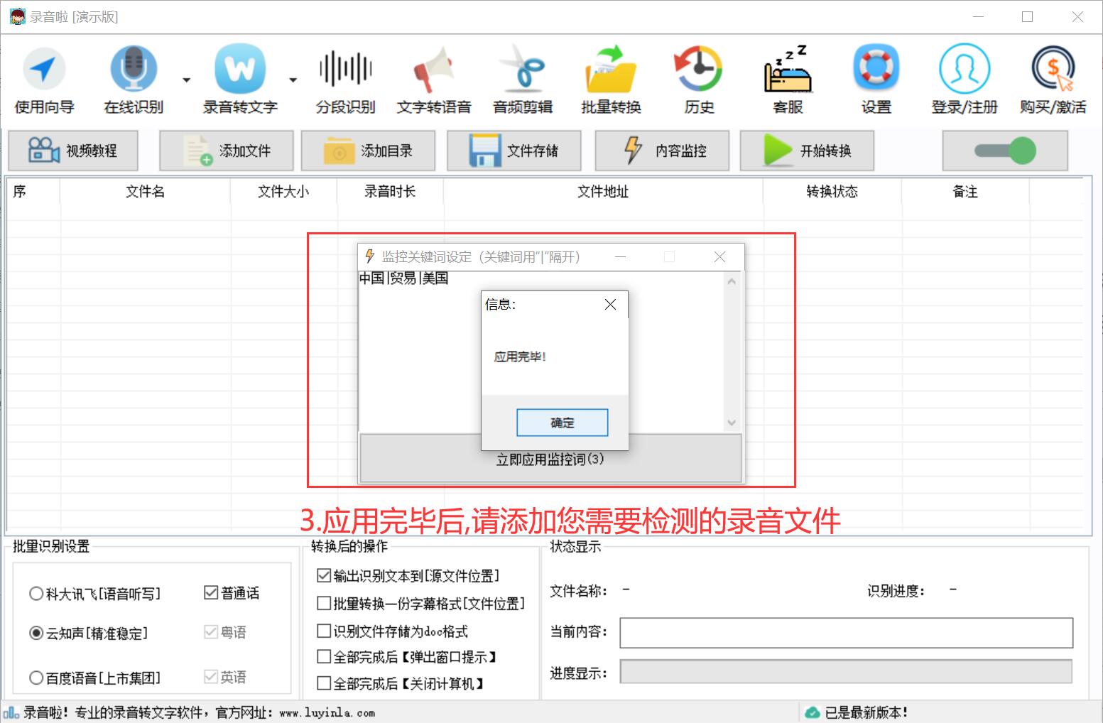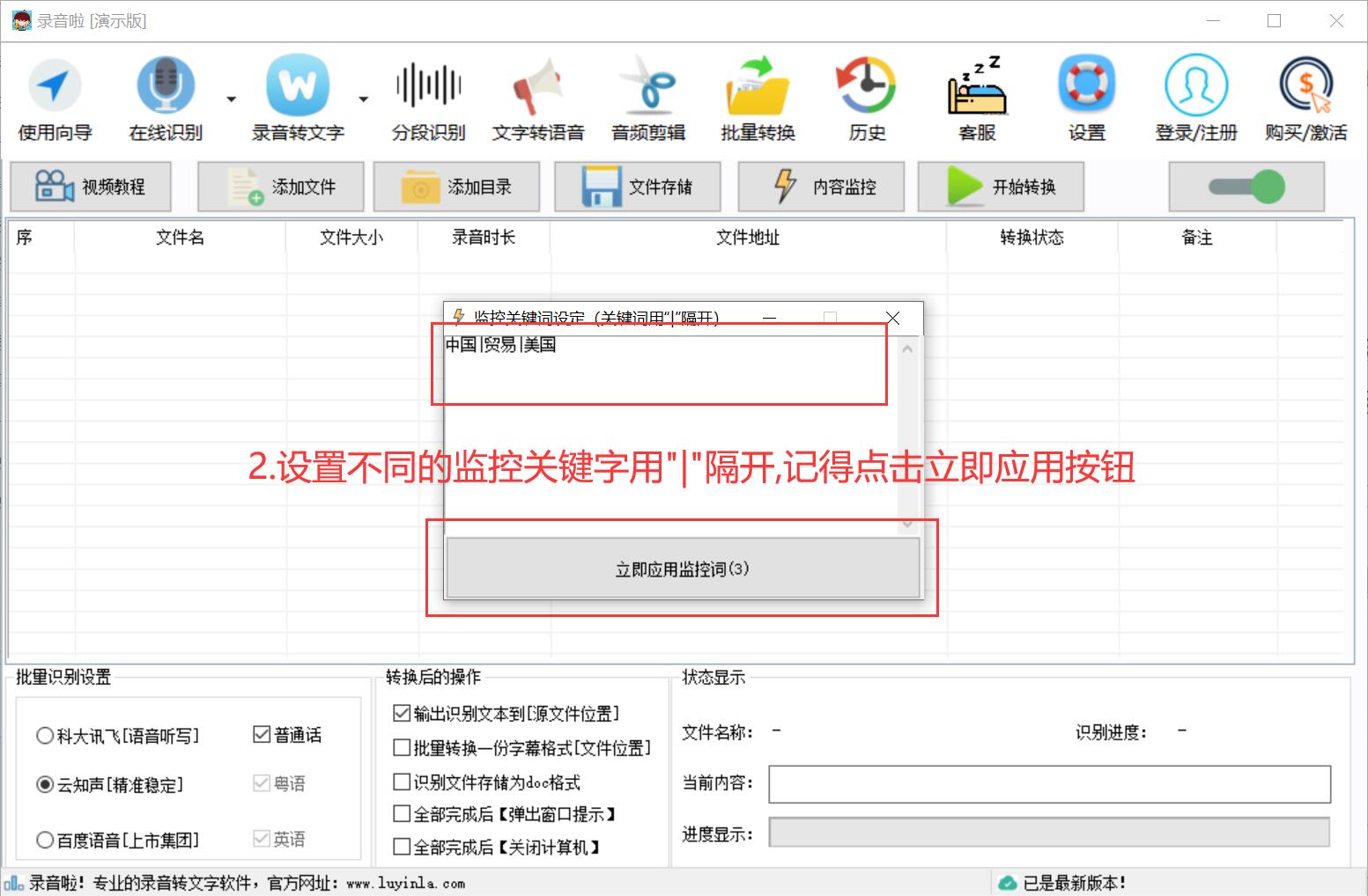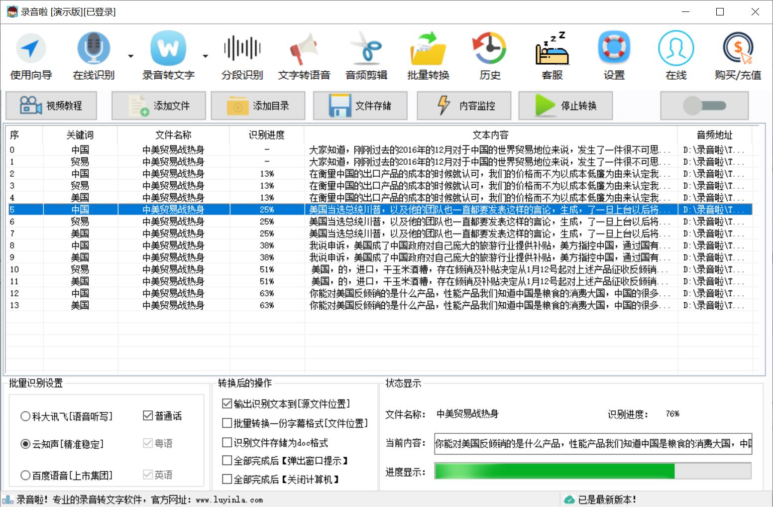 录音啦是一款专业好用的办公辅助软件,它的主要作用在于识别并提取音频中的文字内容,而且支持批处理功能,极大节约时间。下文整理介绍了关于录音啦批量转换功能的使用方法,有兴趣的小伙伴可以查看。 录音啦如何批量识别转换音频文件? 首先下载安装录音啦,打开软件,进入界面,如图,点击【批量转换】功能,  进入新的界面,点击【添加文件】或者【添加目录】,导入需要处理的音频文件,然后点击【开始转换】,录音啦即会按照文件添加顺序进行识别,  耐心等待,识别完成,软件将自动保存识别结果,如图,点击【文件存储】,即可进入对应文件夹,  如图,录音啦默认的文件输出格式为TXT,当然了,你也可以修改为DOC格式。  需要注意的是,录音啦提供了【内容监控】功能,可以对音频文件中的敏感字词进行识别监测,  点击【内容监控】,弹出窗口,添加需要监控的关键词,如果有多个关键词,用"|"隔开,然后点击【立即应用监控词】,   现在导入音频文件,使用软件进行识别,不管是在识别过程中或者识别结束,你可以随时进入监控板块,  如图,这里会显示所有关键词在文本内容中的19. 世界上真的有女娲吗?天上真的有神仙吗?真的有恐龙吗?以前天上真的有10个太阳吗?山川河流,风雨雾雪都是夸父变的吗?我和树说话,夸父会听见吗?所以我想成为一名科学家。位置,让你一目了然。  如果你想使用录音啦的所有功能,务必付费购买软件。想了解更多精彩教程资讯,记得关注wmzhe.com。 体验录音啦批量转换功能,快速识别提取音频内容百花见多识广万点繁星盛开19. 柔和的阳光斜挂在苍松翠柏不凋的枝叶上,显得那么安静肃穆,绿色的草坪和白色的水泥道貌岸然上,脚步是那么轻起轻落,大家的心中却是那么的激动与思绪波涌。60. I’m disappointed in the performance of our team at the sports meeting.186.笔落惊风雨,诗成泣鬼神。《寄李十二白二十韵》 落花已作风前舞,又送黄昏雨。晓来庭院半残红,惟有游丝,千丈袅晴空。来如雷霆收震怒,罢如江海凝清光。录音啦,录音,音频32、Out of sight, out of mind. |