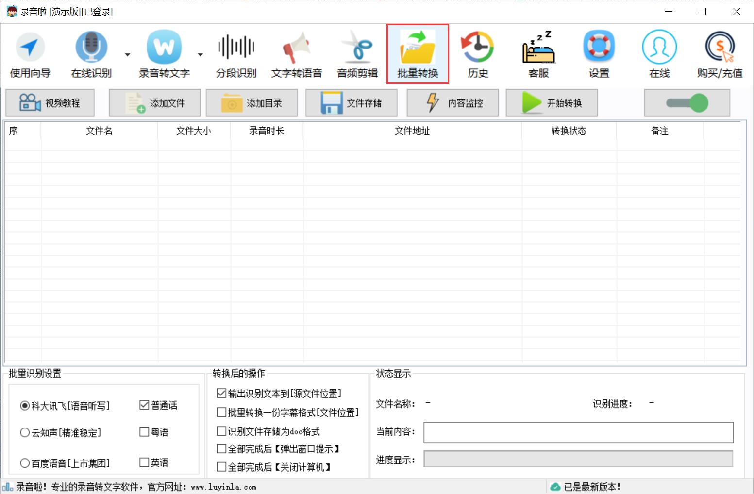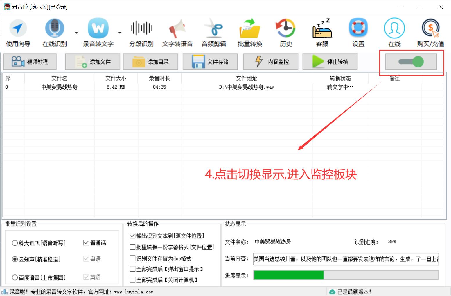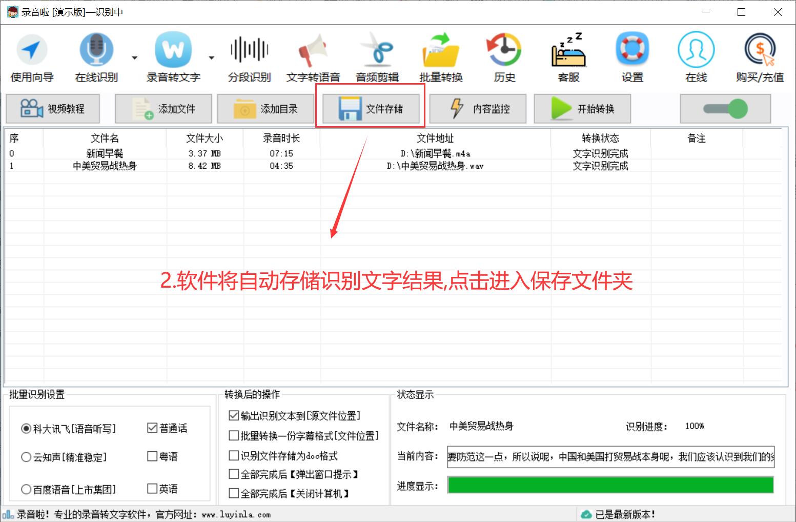 录音啦是一款专业好用的办公辅助软件,它的主要作用在于识别并提取音频中的文字内容,而且支持批处理功能,极大节约时间。下文整理介绍了关于录音啦批量转换功能的使用方法,有兴趣的小伙伴可以查看。 录音啦如何批量识别转换音频文件? 首先下载安装录音啦,打开软件,进入界面,如图,点击【批量转换】功能,  进入新的界面,点击【添加文件】或者【添加目录】,导入需要处理的音频文件,然后点击【开始转换】,录音啦即会按照文件添加顺序进行识别,  耐心等待,识别完成,软件将自动保存识别结果,如图,点击【文件存储】,即可进入对应文件夹,  如图,录音啦默认的文件输出格式为TXT,当然了,你也可以修改为DOC格式。  需要注意的是,录音啦提供了【内容监控】功能,可以对音频文件中的敏感字词进行识别监测,  点击【内容监控】,弹出窗口,添加需要监控的关键词,如果有多个关键词,用"|"隔开,然后点击【立即应用监控词】,   现在导入音频文件,使用软件进行识别,不管是在识别过程中或者识别结束,你可以随时进入监控板块,  如图,这里会显示所有关键词在文本内容中的19. 世界上真的有女娲吗?天上真的有神仙吗?真的有恐龙吗?以前天上真的有10个太阳吗?山川河流,风雨雾雪都是夸父变的吗?我和树说话,夸父会听见吗?所以我想成为一名科学家。位置,让你一目了然。  如果你想使用录音啦的所有功能,务必付费购买软件。想了解更多精彩教程资讯,记得关注wmzhe.com。 体验录音啦批量转换功能,快速识别提取音频内容百花见多识广万点繁星盛开19. 柔和的阳光斜挂在苍松翠柏不凋的枝叶上,显得那么安静肃穆,绿色的草坪和白色的水泥道貌岸然上,脚步是那么轻起轻落,大家的心中却是那么的激动与思绪波涌。60. I’m disappointed in the performance of our team at the sports meeting.186.笔落惊风雨,诗成泣鬼神。《寄李十二白二十韵》 落花已作风前舞,又送黄昏雨。晓来庭院半残红,惟有游丝,千丈袅晴空。来如雷霆收震怒,罢如江海凝清光。录音啦,录音,音频32、Out of sight, out of mind. |