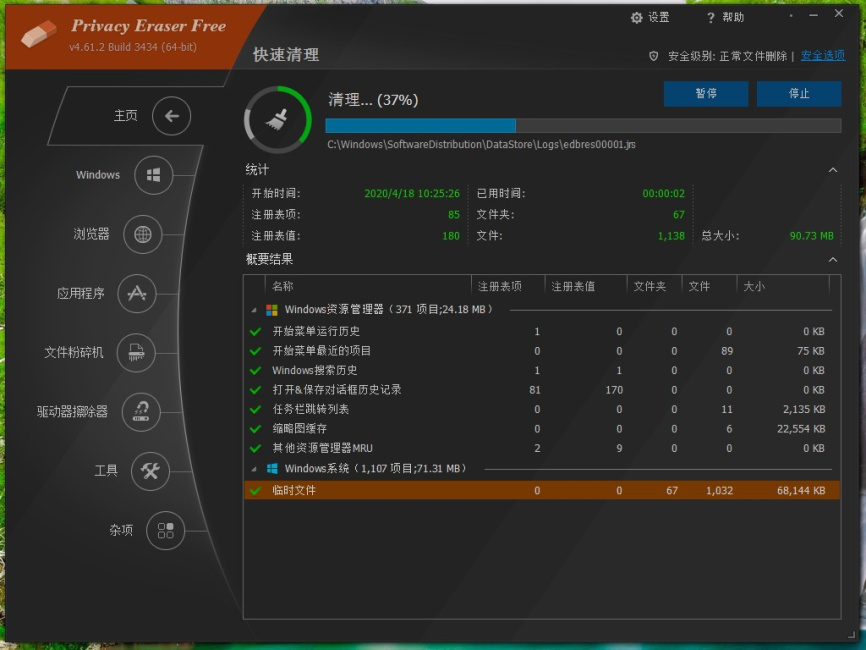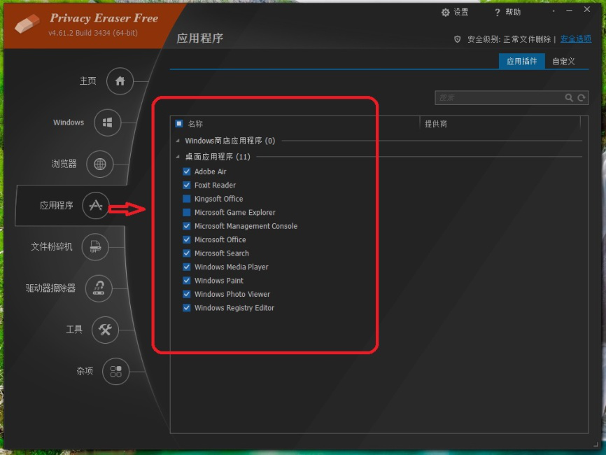 Privacy Eraser free(隐私橡皮擦)是一款电脑隐私清理软件,主要清理对象为internet历史记录和浏览器产生的缓存等可清除文件,从而达到保护用户电脑隐私和保证信息安全的作用。今天来介绍一下Privacy Eraser free的功能和使用。 Privacy Eraser free如何扫描清理电脑垃圾? 1、点击桌面图垂头塌翅拼音:chuí tóu tā chì释义:形容受挫后萎靡不振的样子。出处:《新唐书·萧遘传》君臣报国极矣,战力殚矣,尚能垂头塌翅求生于黄门哉!”示例:无标,打开Privacy Eraser free软件。  2、设置扫描清理选项。在左侧选项分别点击【Windows】、【浏览器】、【应用程序】,根据用户需要依次在其右侧选项中选取需要清理的项目,在该项目左侧□打【√】。   3、点击左侧【主页】选项,然后单击【扫描】。  4、软件开始自动扫描需要清理的选项。  5、扫描完成,点击如图△图标,在其下拉菜单中选取【快速清理】。 注意:Privacy Eraser free提供三种清理模式:一是【快速清理】,即清理完成后不做处理;二是【清理&重启】,即清理后重启电脑;三是【清理&关机】,即清理后关闭电脑。  6、软件自动清理扫描的系统垃圾。  7、软件清理完成。  以上就是使用Privacy Eraser free清理电脑的一般操作。除此之外,用户还可直接点击【主页】选项中【快速清理】、【清理&重启】、【清理&关机】进行快捷清理。 -
