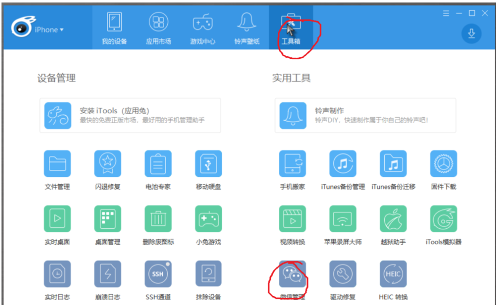 微信是大家经常使用的一款社交软件,无论是日常聊天,还是工作交流,微信中存储的消息非常多。为了便于管理,iOS用户可以通过iTools进行微信管理,备份聊天记录中的图片和视频。 如何使用iTools管理苹果垂头搨翼拼音:chuí tóu dá yì释义:形容受挫后萎靡不振的样子。出处:汉·陈琳《为袁绍檄豫州文》方畿之内,简练之臣,皆垂头搨翼,莫所凭持。”示例:无手机微信消息? 下载安装iTools,打开软件,进入界面,如图,提示缺少驱动组件,正在进行安装,  使用数据线连接iPhone手机和电脑,iTools会自动识别设备,在手机端点击【信任】,输入密码,即可让手机和iTools进行连接,   如图,回到软件界面,点击右上角的【工具箱】,你可以看到【微信管理】功能,  点击【微信管理】,弹出面板,如图,点击【扫描】,软件即会扫描iPhone手机,获取数据信息,  扫描需要时间,耐心等待,扫描完成,软件可以备份微信内容,并找回部分已删除的聊天记录。  想了解更多精彩教程资讯,关注wmzhe.com。 -