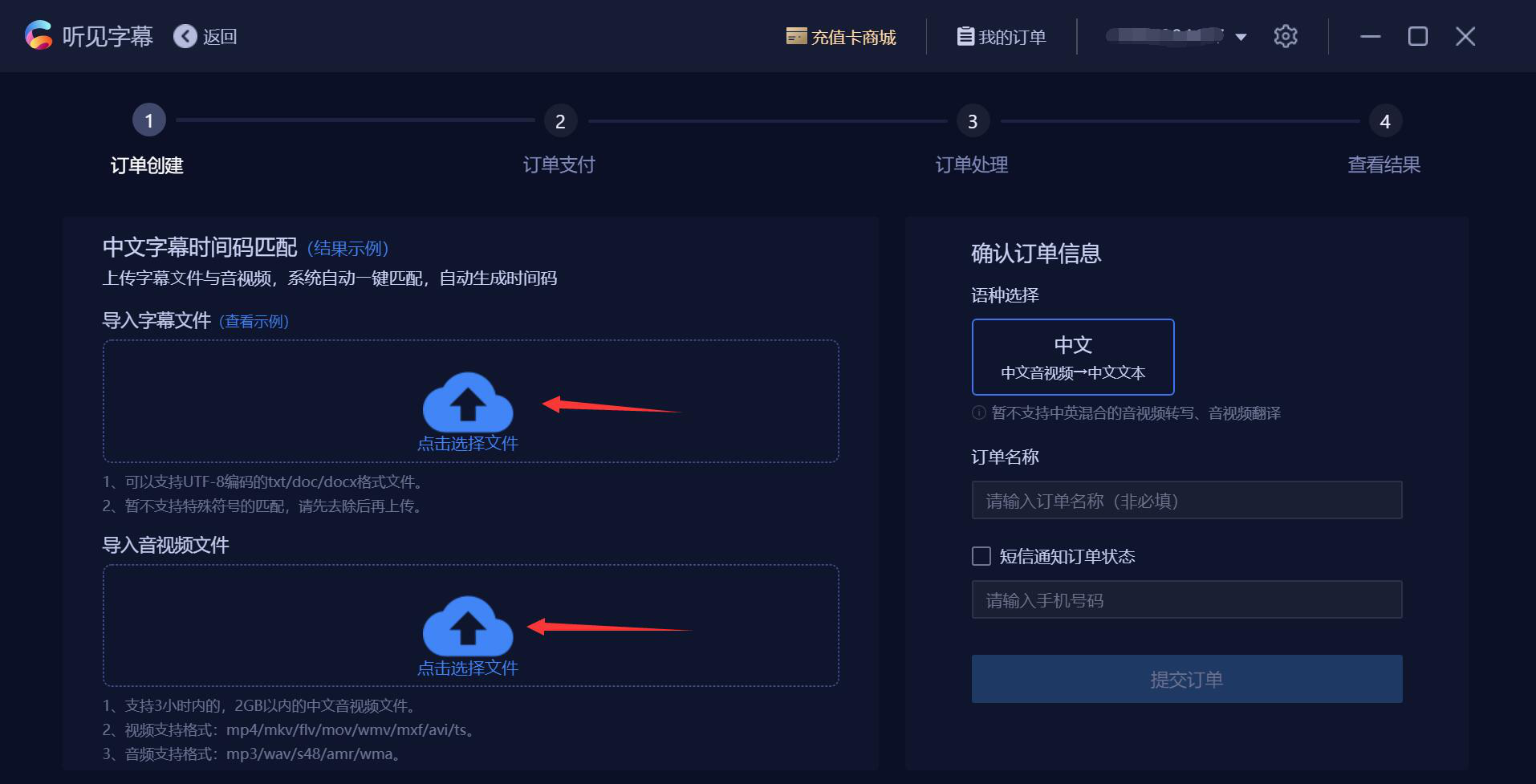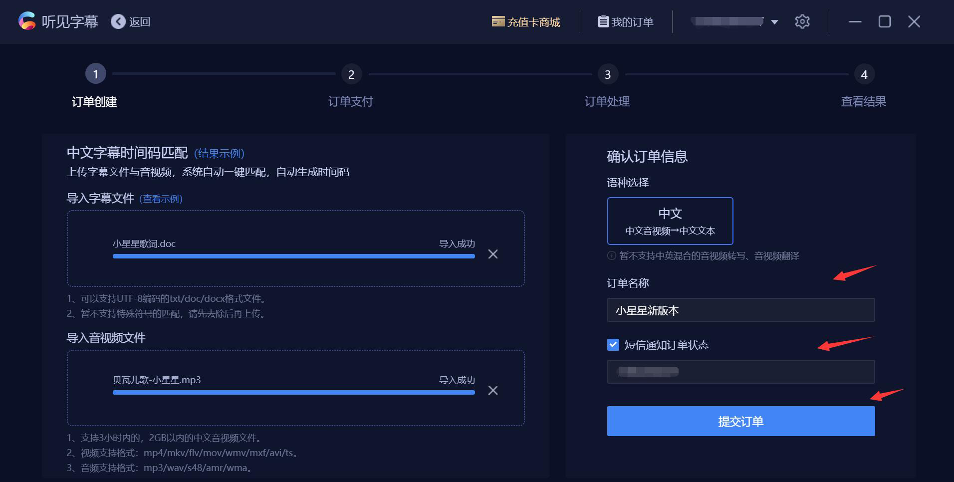 很多用户在完成音视频录制的时候,都需要对音视频添加相关的中文字幕来让整个作品变得更加完整、更有可观性。可是自己又不愿意一边播放音视频一边添加字幕文件,觉得这样的工序太繁杂太浪费时间。那么,用听见字幕就可以解决这一问题。听见字幕有中文字幕时码匹配功能,能上传字幕文件和音视频一键匹配,并且自动生成时间码。可是很多新用户不了解怎么操作,所以,本文将详细讲解听见字幕如何进行中文字幕时码匹配,帮大家做出优秀的音视频。 如何使用听见字幕的中文字幕时码匹配功能? 1、首先,用户需要注册登录听见字幕。输入注册时的手机号和密码,点击“登录”按钮。  2、然后,在听见字幕的向导页中,点选“中文字幕时间码匹配”,再点击“20. 机器人是怎么发明出来的?手机为什么可以看这么多视频,人家是怎么放上去的?人们是怎么想出来飞机的?又是怎么造出来的?为什么他们那么聪明,能发明这么多好东西?我长大了也要发明好多东西,当一个发明家。开始制作”的按钮,从而进入听见字幕的中文字幕时码匹配操作。  3、此时,听见字幕会弹出字幕文件示例的窗口,用户点击“我知道了”的按钮即可。  4、接下来,在听见字幕的中文字幕时码匹配界面,用户需要导入字幕文件和音视频文件,如下图所示。  5、当文件导入成功后,用户需要在右侧订单信息处,填写文件输出的名称,并点击“提交订单”的按钮。  6、最后,在听见字幕的订单支付界面中,用户需要选择支付方式,并点击“立即支付”的按钮进行支付即可完成。  听见字幕在进行中文字幕时码匹配的过程中,如果自己导入的文件是比较大的话,那就在确认订单的界面中勾选“短信通知订单状态”。当听见字幕执行中文字幕时码匹配的操作完毕后会有短信通知用户。 -