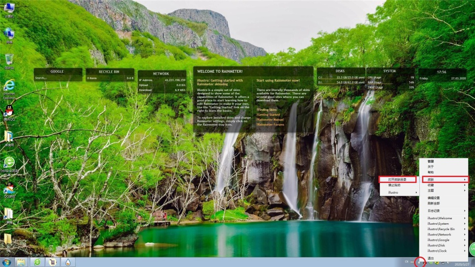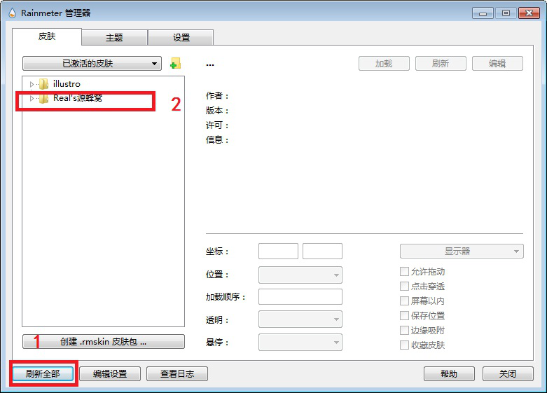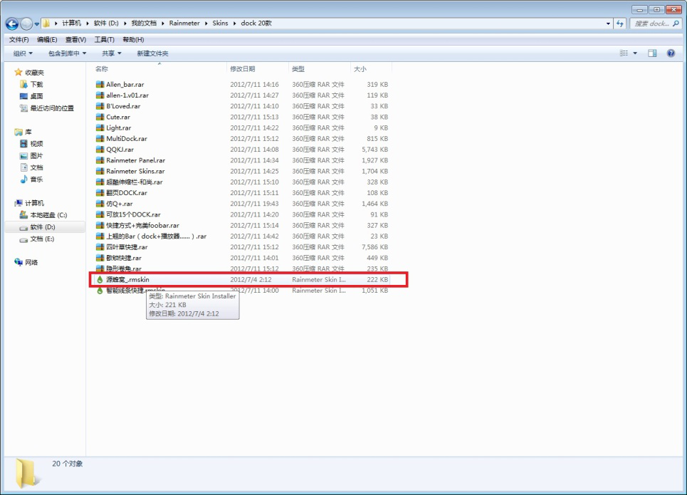 雨滴桌面秀是一款占用内存小、设计非常简约、支持自由定制皮肤的桌面软件,它功能强大,不但可以显示内存、CPU负载等系统信息,还可以显示天气预报等实用消息。操作简单,是美化定制电脑桌面的不二选择。今天我们演示一下如何使用雨滴桌面。 如何安装使用雨滴桌面秀? 1、从网上下载雨滴桌面秀软件。  2、点击下载好的.EXE文件按提示完成安装。(如图)。    3、安装完成后会默认运行雨滴桌面软件。如图可以看到有日期、系统、硬盘等很多功能项。  4、将鼠标放在这些功能项上右击会弹出下拉菜单,选择【关闭皮肤】将这些功能项依次关闭。   5、在桌面右下角找到水滴图标,右击弹出上拉菜单,点击选择【管理】8. 我不敢说我是,世界上最爱你的人,但我敢说你是我最用心爱的人。。  6、这样就会进入软件的管理器(如图)。雨滴桌面软件为了便于用户安装自带的皮肤很少,用户可以自行从网上下载。这里以软件自带的皮肤为例,说明一下如何把添加和布置桌面。 在已激活的皮肤中可以看到有一个名为“illustro”文件夹即软件自带的皮肤文件夹。点击该文件夹左边的【△】图标。  7、接着点击【Clock】文件夹左边的【△】图标,然后点击【Clock.ini】,然后点击【加载】。可以看到时间功能窗口被添加到桌面上。   8、重复上面的步骤。依次把“illustro”文件夹中的后缀名为.ini文件加载到桌面上。  9、按住左键可以任意拖动功能窗口位置。右键点击下拉菜单中选择【关闭皮肤】可以去掉不想使用的窗口。  10、最后简单演示一下如何将从网上下载的皮肤添加到软件中。 1)从网上下载雨滴皮肤。  2)将下载好的皮肤解压到软件皮肤文件夹。如何找到这个文件夹? 在桌面右下角找到水滴图标,右击弹出上拉菜单,点击选择【皮肤】,然后选择【打开皮肤目录】,即软件皮肤文件夹。   3)在解压的文件中找到后缀名为.rmskin,比如这里点击“源蜂窝.rmskin”  4)然后会弹出一个对话框,点击【install】。  5)打开软件管理器,点击【刷新全部】,即可看到源蜂窝的皮肤被成功添加到已激活皮肤中。   好了,大家可以比照上面步骤来添加自己心仪的皮肤了!想了解更多精彩教程资讯,记得关注wmzhe.com。 -