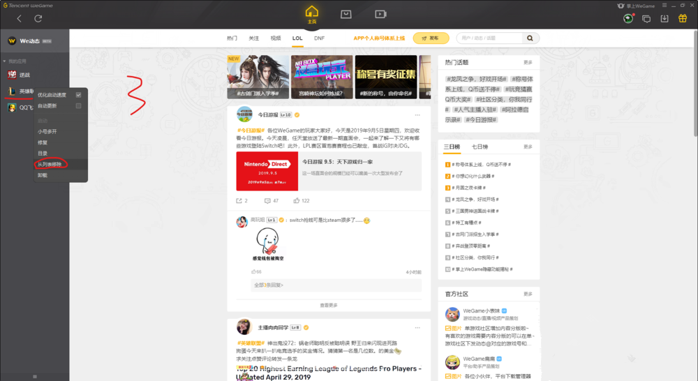 腾讯wegame是一款面向全球玩家的游戏平台,最近有用户反映,腾讯wegame无法运行英雄联盟游戏,这是为什么呢?鉴于此,小编整理了一个简单有效的解决方法,如果你有需要,可以试试这一方法。 腾讯wegame无法启动英雄联盟怎么办? 首先打开腾讯WeGame游戏平台,进入界面,如图,点击上方的图标,左侧面板即会显示你电脑上的一些游戏,   如图,将鼠标移动到英雄联盟图标上,鼠标右击,弹出菜单,选择【从列表移除】,即可删除英雄联盟的快捷打开方式,  在左侧面板中点击最下方的【三】,选择【添加】,然后选择添加方式为【手动添加应用】,   弹出对话框,在英雄联盟的安装目录下找到包含英雄联盟所有文件的那个文件夹,鼠标单击选中,点击右下角的【选择文件夹】,这时你会发现左侧【我的应用】列表中的英雄联盟图标重新出现,再次点击启动,即可恢复正常!   如果你也遇到了腾讯wegame无法启动lol的情况,可以使用文中介绍的方法进行解决。想了解更多精彩教程资讯,记得关注wmzhe.com。 -