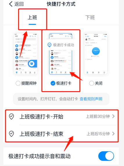随着时代的发展,一些传统的员工考勤方式(包括纸质签到、指纹识别、人脸识别)已经被取代,现在可以通过各种手机软件实现上下班打卡。钉钉是很多公司都在使用的一款智能办公软件,提供了多种打卡方式,为了节约时间,小编建议大家使用极速打卡。 如何设置启用钉钉极速打卡功能? 在手机中打开钉钉APP,登录账号,进入界面,如图,点击下方的【工作】选项,  进入工作台,如图,点击【内外勤管理】——【考勤打卡】功能,  进入以下界面,点击右下角的设置按钮,接着进入设置界面,点击【快捷打卡方式】,   首先设置上班快捷打卡方式,如图,勾选【极速打卡】,设置打卡时间范围,  再来设置下班快捷打卡方式,鉴于很多人没有在下班时间打开钉钉的习惯,建议选择【提醒闹钟】模式,下班之后就不会忘记打卡了。  设置完成,只要你的定位在考勤范围之内,上班之前打开钉钉即可实现极速自动打卡。  想了解更多精彩教程资讯,请关注wmzhe.com。 -