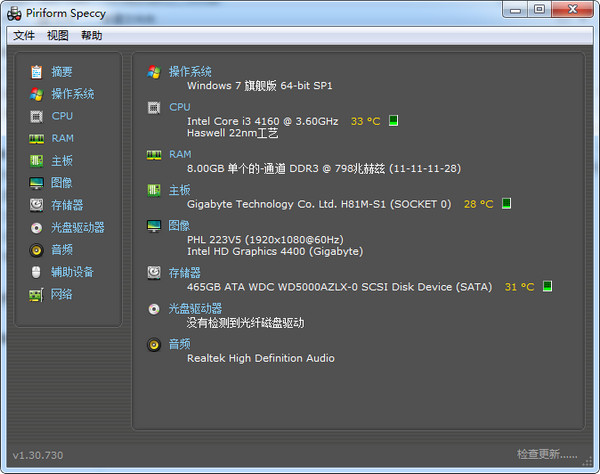 电脑在我们的生活中是越来越常见了,不过呢,有很多用户对于自己电脑的硬件配置信息不太了解。在购买新电脑或为旧电脑换配件时很难判断主板的品牌、芯片组或者内存正在运行的频率等,往往心里没底。 Speccy是一款免费实用的硬件信息检测工具,与CCleaner、Recuva同属一公司出品。软件功能类似于AIDA64、鲁大师等,不过Speccy比前两者要小巧得多,它能准确识别出电脑硬件详细配置信息,如CPU、内存、主板、显卡、声卡、硬盘、网卡等,让你对电脑的了解更加透彻,方便你升级、维修更换配件或在购买新硬件时避免被奸商用假货/低喙长三尺拼音:huì cháng sān chǐ释义:喙嘴。嘴长三尺。形容人善于辨说。出处:《庄子·徐无鬼》丘愿有喙三尺。彼之谓不道之道,此之谓不言之辩。”示例:无端型号蒙骗。  透过Speccy,我们可以快速清晰地了解到诸如电脑主板芯片组是什么,CPU是多少步进,内存是DDR几?显卡是什么核心什么频率?硬盘是IDE还是SATA的几代等等。你完全可以不拆机箱即可快速了解所有这些硬件信息,在需要购买、替换、升级硬件时这些信息显得尤其重要。 虽说查看硬件信息的软件不少,但Speccy的优势在于,以较小的体积(3M)实现了其它同类软件的功能,而且所提供的软硬件信息详实且专业。您可以将它放在U盘中随身携带,不需要安装,也不占用多少资源。 Speccy——体积小巧、专业实用的硬件检测工具螳臂苦苦防不胜防地想(苦思冥想)挡车45. 先行一步,也许是冒险,但谁敢说,冒险不是一种智能,一种成功的契机。如果你有空闲时间我的家乡做客,我会非常乐意做你的导游。杜牧235.停车坐爱枫林晚,霜叶红于二月花。《山行》 牛渚天门险,限南北、七雄豪占。清雾敛,与闲人登览。我来正逢秋雨节,阴气晦昧无清风。Speccy,硬件检测For the reasons given above, I feel that… |