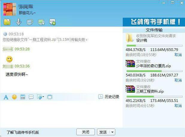 被广泛应用于大学宿舍、公司企业的飞鸽传书软件,它应用于局域网,安全可控,所以很多人都会用它来传游戏和传输文件。但是,很多刚接触它的新用户,都问及到飞鸽传书软件怎么传输文件?所以,本文来为大家分享下飞鸽传书软件传输文件的教程。 飞鸽传书软件如何传输文件? 1、首先,运行飞鸽传书软件。在它的主界面中,点击联系人,选择自己要传输文件的对象。  2、然后,在飞鸽传书软件的聊天窗口中,点击左上角的“发送文件/文件夹”。此时,飞鸽传书软件会弹出选择文件的窗口,用户即选择要传输的文件。  3、然后,在飞鸽传书软件的聊天窗口中,点击左上角的“发送文件/文件夹”。此时,飞鸽传书软件会弹出选择文件的窗口,用户即选择要传输的文件。  4、飞鸽传书软件传输文件完毕后,用户还可以点击“文件”来查看自己所传输的所有文件。  5、飞鸽传书软件除了可以向一个对象传输文件,还可以点击群发,将文件一次性传输给更多的人。  6、如果用户需要手机电脑利用飞鸽传书软件来实现文件传输。那么就要在飞鸽传书的电脑端,点击“系统设置”,在系统设置中选择“网络设置”。手机和电脑连接同一个无线网络,并将网段设置成一样就可以实现文件传输了。  其实,用飞鸽传书进行文件传输的过程和平时我们用的QQ差不多。不同的是,飞鸽传书仅限于局域网。如果出现飞鸽传书传输不了文件的情况,那需要检查下防火墙软件是否禁止了飞鸽传书软件访问网络。 -