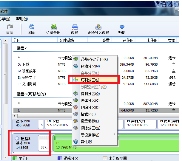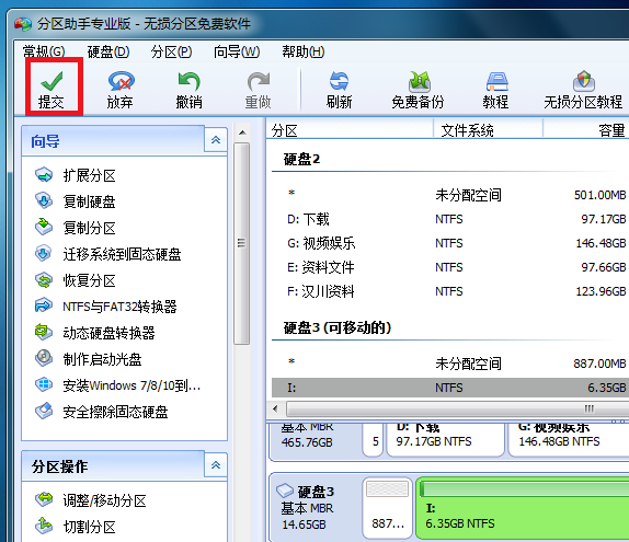U盘是大家比较常用的一个移动存储设备,内存很大,便于保存文件资料,默认情况下,U盘只有一个分区,如果想将U盘进行分区应该怎么操作呢?今天小编就教大家使用分区助手对U盘进行划分,有兴趣的小伙伴可以参考学习。 如何实现U盘无损分区? 准备工作:先在电脑中安装分区助手,然后插入U盘, 打开分区助手,进入界面,你可以看到电脑上的所有磁盘,找到U盘设备(硬盘3),鼠标右击,弹出菜单,选择【切割分区】,  进入新的窗口,使用鼠标拖动调节按钮,设置新分区的大小与位置,进行切割分区,调整完毕,点击确定按钮,   完成以上操作,返回到软件主页,点击上方的【提交】按钮,  弹出对话框,直接点击【执行】按钮,  现在软件会自动执行U盘分区操作,这个过程需要一段时间,耐心等待,  U盘分区成功,软件会有提示,点击确定,关闭对话框,  注意:在Windows系统中无法同时识别U盘中的两个分区,只能识别使用其中一个分区,但是在Linux系统中可以正常识别U盘分区。想了解更多精彩教程资讯,请关注wmzhe.com。 -