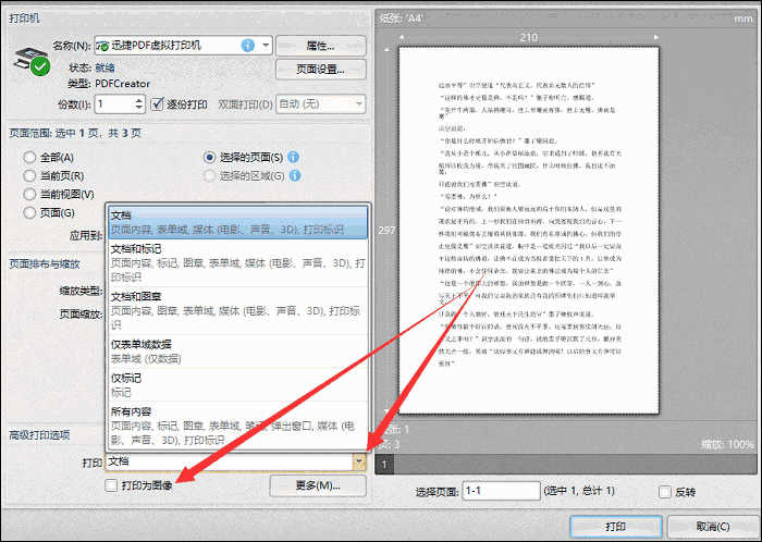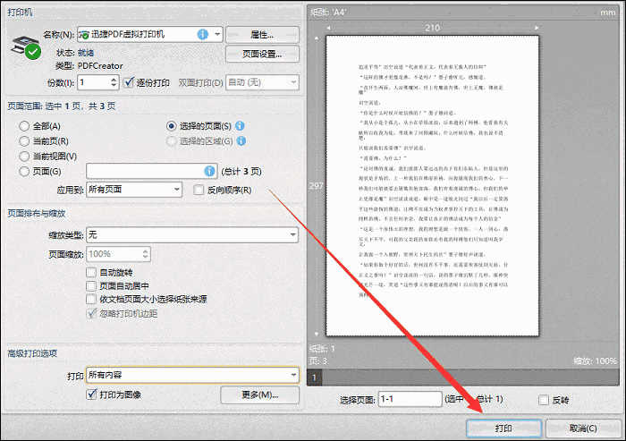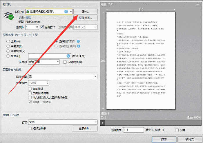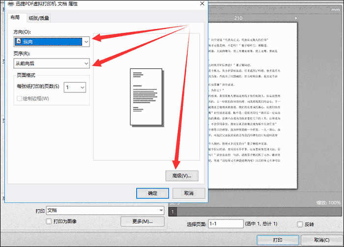 PDF文件编辑完成,大家可以借助虚拟打印机进打印,最近有小伙伴反映说遇到了无法打印PDF文件的情况,这该25. 别说一辈子,别说永远,谁能对未来承诺呢?我们能把握的,无非是当时当地的感情。但一辈子,也是无数个现在组成的,努力好了每个瞬间,也就是永远了。如何解决呢?通过情况下,导致这一问题的原因是系统不兼容或者PDF虚拟打印机安装失误,下文整理了具体解决方法。 PDF文件打印不出来怎么办? 首先打开迅捷PDF编辑器,进入主页,导入PDF文件,然后在菜单栏中点击【文件】——【打印】选项,即会自动跳转到迅捷PDF虚拟打印机页面,  如图,现在开始进行各项设置,点击右上角的【属性】按钮,进入布局设置页面,  你可以调整纸张方向(横向或者纵向),另外,你还可以针对页序、纸张颜色进行设置,接着点击下方的【高级】选项,  进入高级设置页面,你可以设置纸张规格、打印质量,还可以替换原有字体,设置完成,点击确定即可,  返回到PDF虚拟打印机窗口,点击【高级打印选项】,在展开菜单中可以选择打印内容,包括文档、文档和标记、所有内容等等,也可以勾选【打印为图像】,  完成所有设置,点击右下角的【打印】,即可完成PDF文件打印。  如果你对于PDF虚拟打印机的使用存在其他疑问,可以关注wmzhe.com整理的文章说明。 -