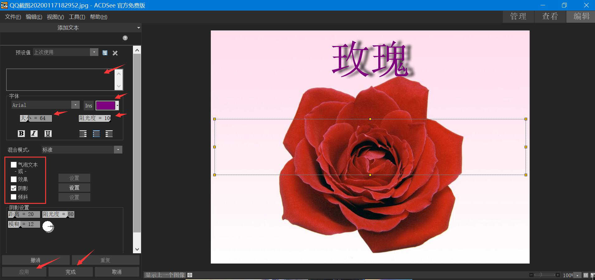 很多用户觉得用PS来处理图片,需要比较专业的技术,而且对于初学者来说并不能轻易上手。所以,很多没有设计经验的人在处理图片的时候,都会选择使用acdsee。那acdsee是什么软件?怎么使用?下面来为大家详细介绍。 acdsee是什么软件? acdsee是一款圈粉无数的图像处理软件。使用acdsee,可以快速帮助读取摄影师数码相机和扫描仪中的图片。还配有内置的音频播放器,可以用它播放幻灯片。另外,acdsee软件还支持超过50种的多媒体格式,批量处理图像文件。 acdsee怎么使用? 1、很多初学者用户问到acdsee怎么使用。我们首先可以在本站下载acdsee软件,安装并运行,运行后的界面如下图所示。  2、接下来,在acdsee软件中点击菜单栏的“文件”打开所需要的编辑的图片。  3、在acdsee软件使用时,用户把需要编辑的图片选中,然后点击界面右上方的“编辑”按钮,从而进入acdsee的编辑操作。  4、接着,acdsee软件会弹出编辑的操作界面。在界面左方,可以看到有很多的编辑工具供用户使用。例如,这里想给这朵玫瑰花添加文字,那么就点击“文本”。  5、在acdsee软件的文本操作界面,用户可以输入索要的文字并设置文字的格式、大小等等。  6、用户将图片编辑完成后,点击acdsee软件主界面的左上方的&29. 你身上的味道最好闻,你笑起来的样子最好看,你陪着我的时候,我从没羡慕过任何人,很想陪你走完这一生。ldquo;文件”,对该图片进行另存为,重新命名,并点击“保存”按钮即可。  acdsee软件是什么?其实,它就相当于是一个简化版的PS软件,可以对图片进行一些基本的难度低的操作。至于acdsee使用方面,其实也简单易懂,用户根据自己所需要的效果挑选对应的工具进行美化编辑即可。想了解更多精彩教程资讯,请关注wmzhe.com。 -