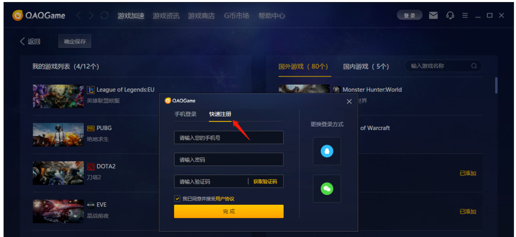 QAQGame是当下比较流行的的一款游戏加速器,经历不断更新,功能越发完善,最重要的是不收钱,这也是它的一个优势。为了让大家对QAQGame加速器有一个初步印象,小编就以游戏《魔兽世界》为例,简单介绍如何加速游戏。 QAQGame如何加速魔兽世界? 下载安装QAQGame游戏加速器,打开软件,进入界面,首先需要注册账号,你可以使用手机号进行注册,也可以通过微信号、QQ号进行登录(需绑定手机号),  输入账号,进行登录,然后进入加速器,如图,点击【添加/编辑游戏】,搜索找到魔兽世界,进行添加,  回到主界面,如图,点击【启动加速】,即可加速魔兽世界,  加速成功,点击【开始游戏】,进入游戏,现在你可以获得不一样的游戏体验啦!  如果你对于QAQGame加速器的使用存在其他疑问,可以参考wmzhe.com整理的文章教程。 29. 失恋后要善于排除自己的痛苦,会运用旅游、散步、听音乐、看书、写作、运动、与人倾谈、更勤奋的工作等办法来分散注意力,自我解脱。 -